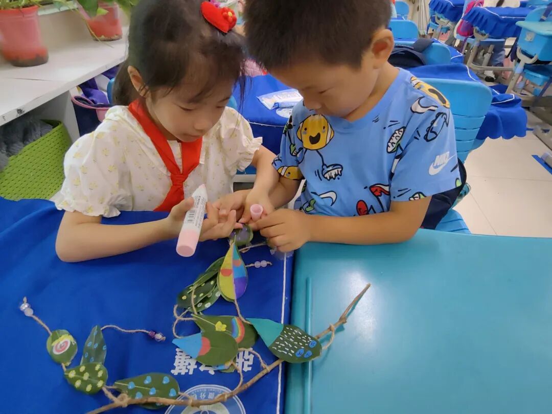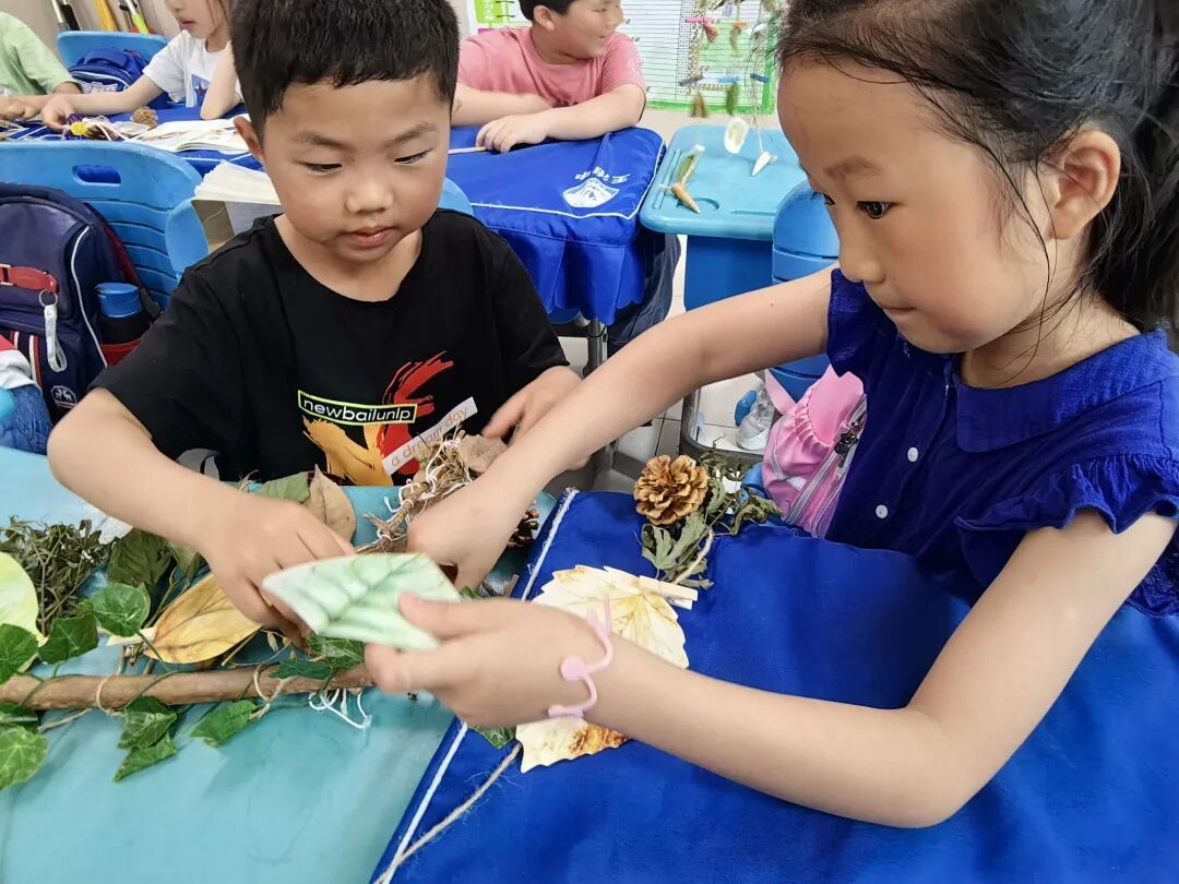 孩子用植物的叶子、果实、枝干进行颜色形状的搭配,并用绳子串联,制作成了美丽的树叶风铃。