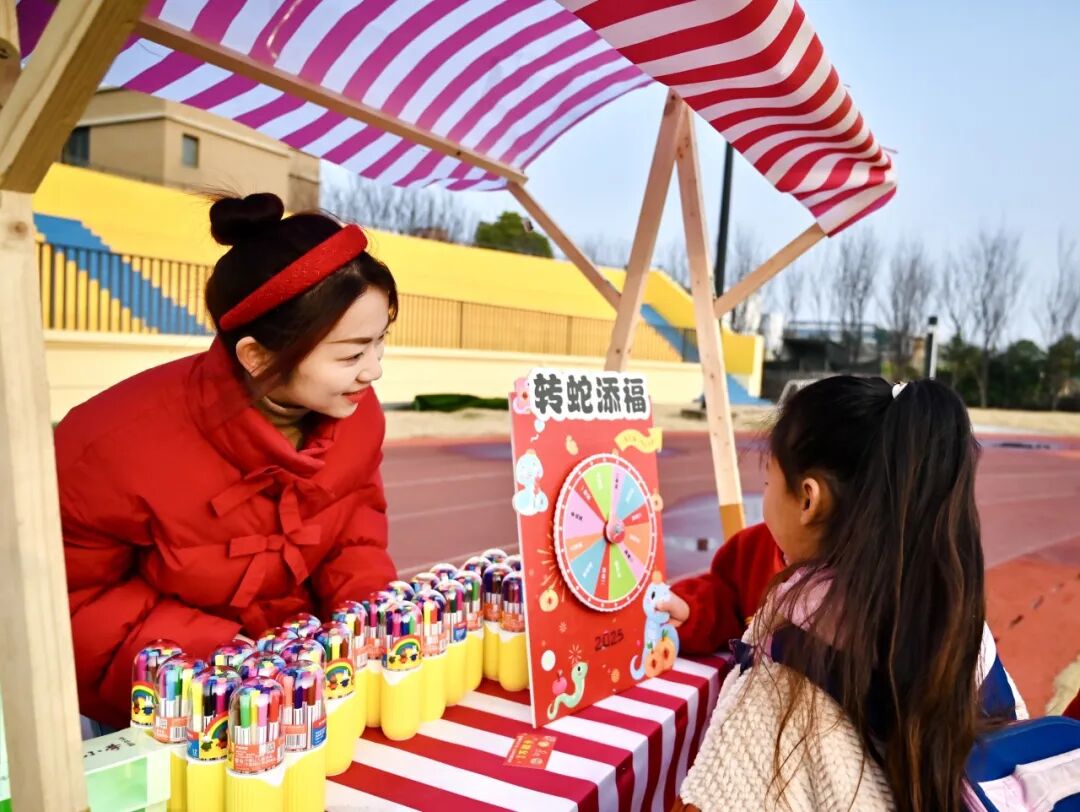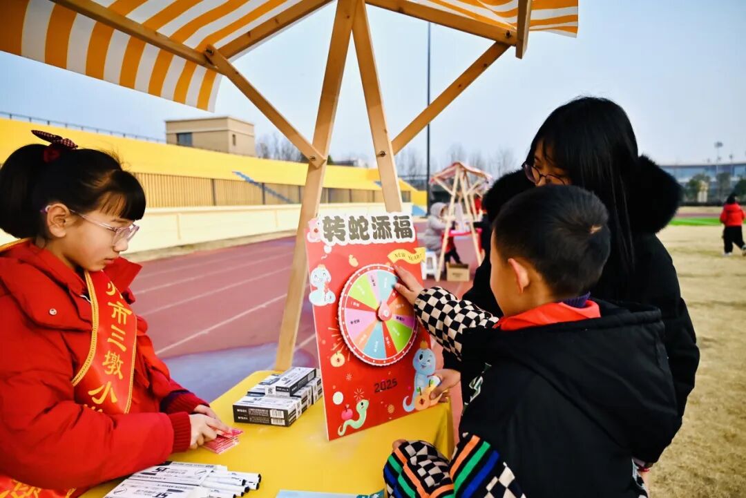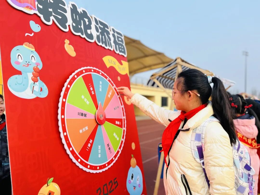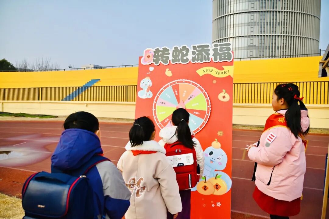 “快,轮到我转啦!” 在不远处的 “转蛇传福大转盘” 区域,孩子们排着队,眼睛里闪烁着期待的光芒。一个个色彩鲜艳的大转盘上,划分着不同的奖品区域。用力转动转盘,随着指针的飞速旋转,大家都屏住了呼吸。“哇,是一等奖!” 指针停下,可爱的孩子们都激动地跳了起来。每一次转动,都承载着孩子们对幸运的期待,收获的奖品更是为新学期增添了一份惊喜。