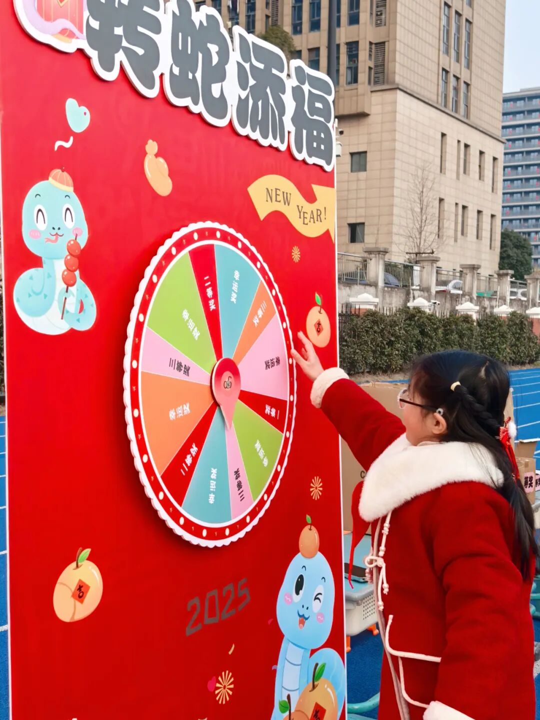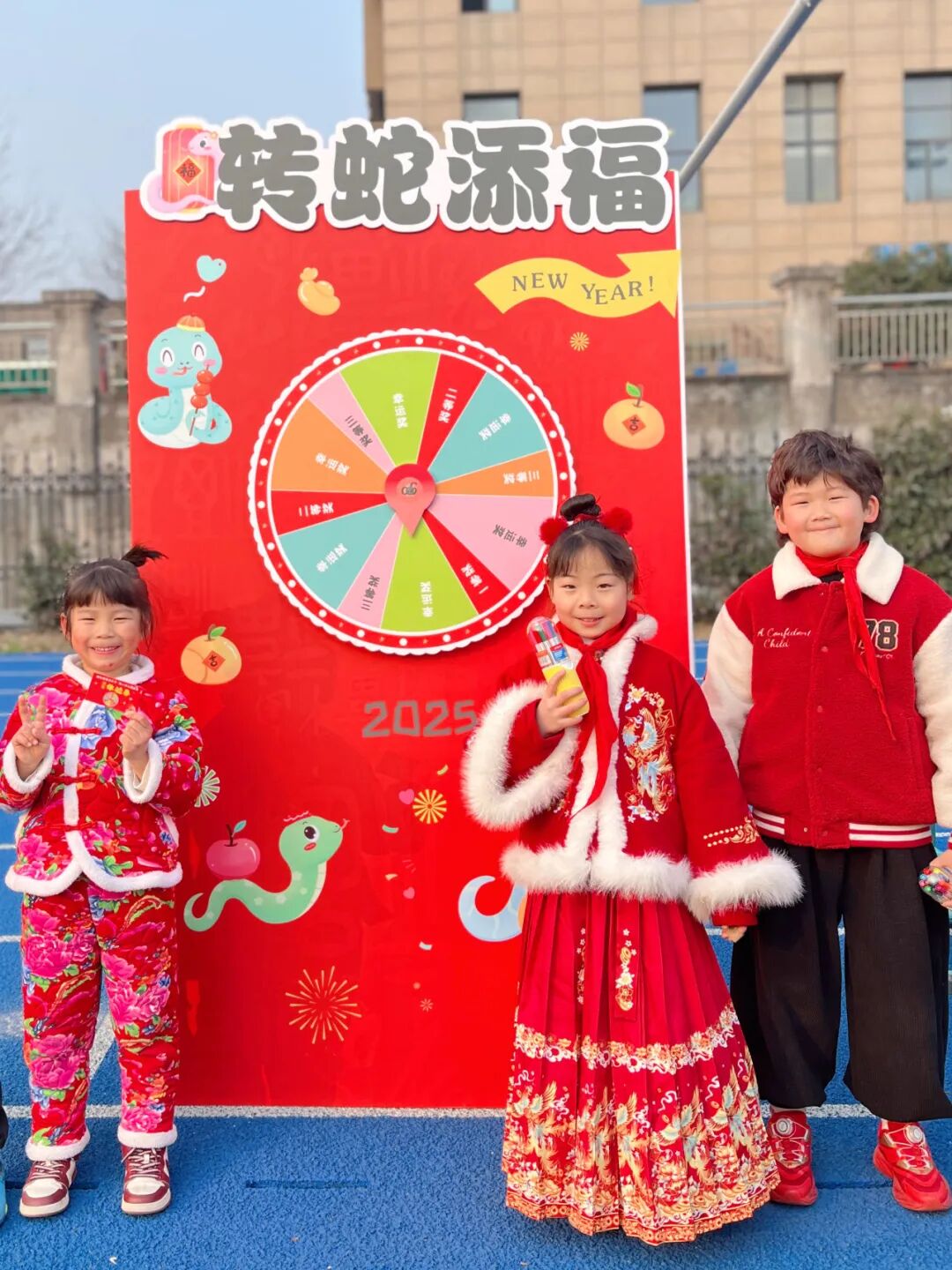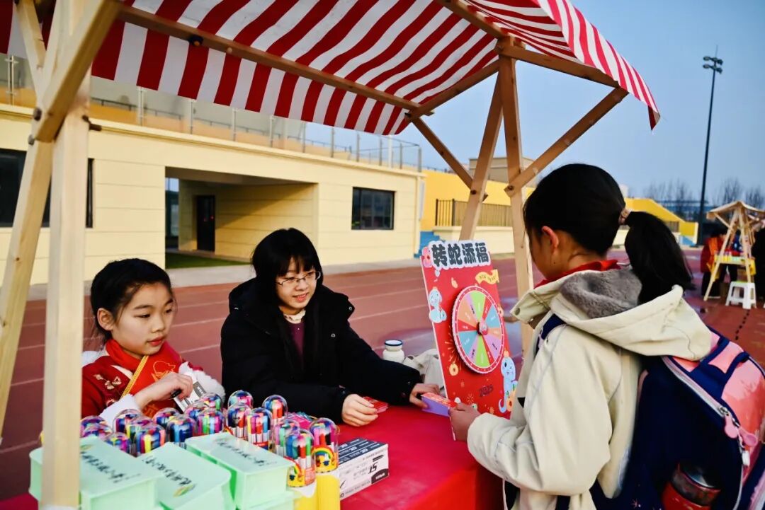 “快,轮到我转啦!” 在不远处的 “转蛇传福大转盘” 区域,孩子们排着队,眼睛里闪烁着期待的光芒。一个个色彩鲜艳的大转盘上,划分着不同的奖品区域。用力转动转盘,随着指针的飞速旋转,大家都屏住了呼吸。“哇,是一等奖!” 指针停下,可爱的孩子们都激动地跳了起来。每一次转动,都承载着孩子们对幸运的期待,收获的奖品更是为新学期增添了一份惊喜。