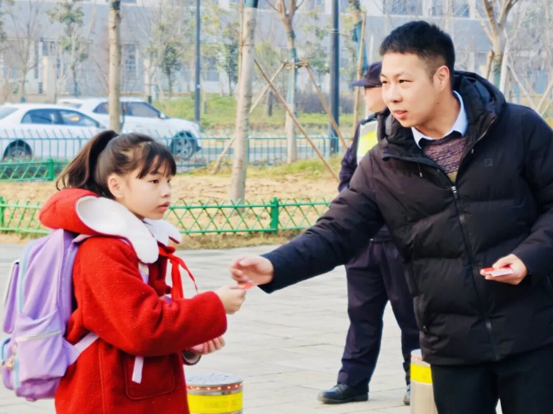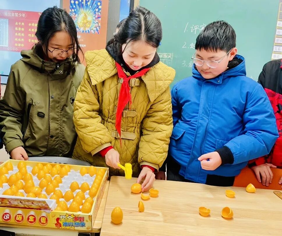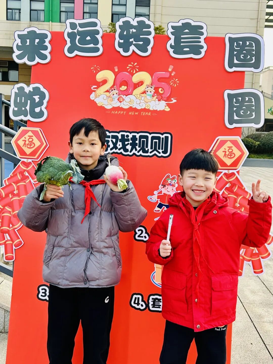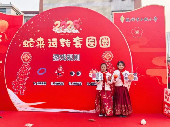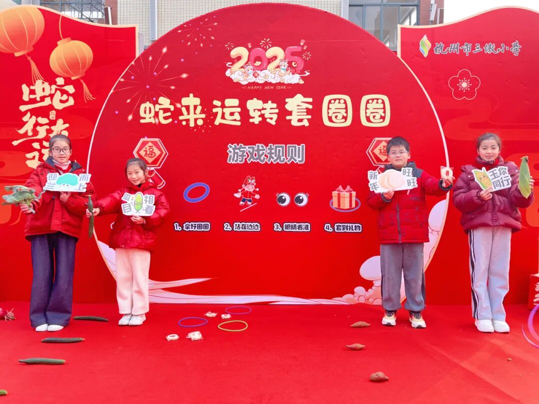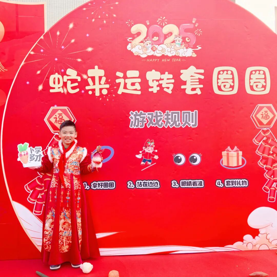 “哇,好多水果和蔬菜!我要套个‘心想事橙’!” 刚进校园,孩子们就被热闹的 “蛇来运转套圈圈” 游戏吸引。操场上,摆放着象征各种美好寓意的水果和蔬菜,“大吉大梨”“卜学多才”“好柿发生”…… 孩子们手持套圈,眼睛紧紧盯着目标,身体微微前倾,嘴里还念叨着:“一定要套中呀!” 当套中目标的那一刻,欢呼声顿时响起,“我套中啦!今年肯定能事事顺利!” 孩子们套中的不仅仅是奖品,更是套住了对新学期的美好期许。