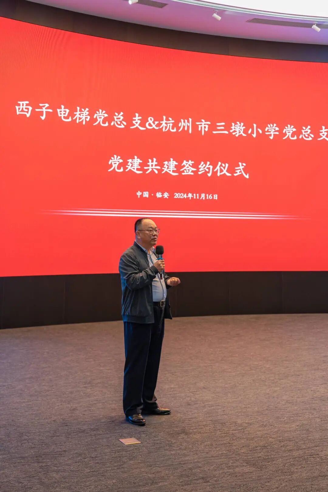西子电梯科技有限公司负责人为大家介绍了企业党建品牌的发展历史和愿景,并表示,校企党建共建是贯彻落实新时代党的建设总要求的重要举措。希望双方以此次签约为契机,充分发挥各自优势,创新党建工作方式,为推动教育事业和企业发展作出更大贡献。