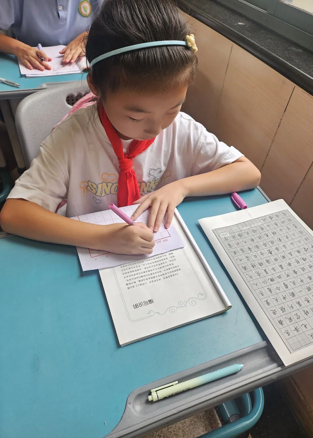 五六年级的同学们开展了“红色经典钢笔书法展”活动。看,那认真书写的样子、端正的字迹都是对普通话无言的宣传。他们个个都是优秀的践行者。