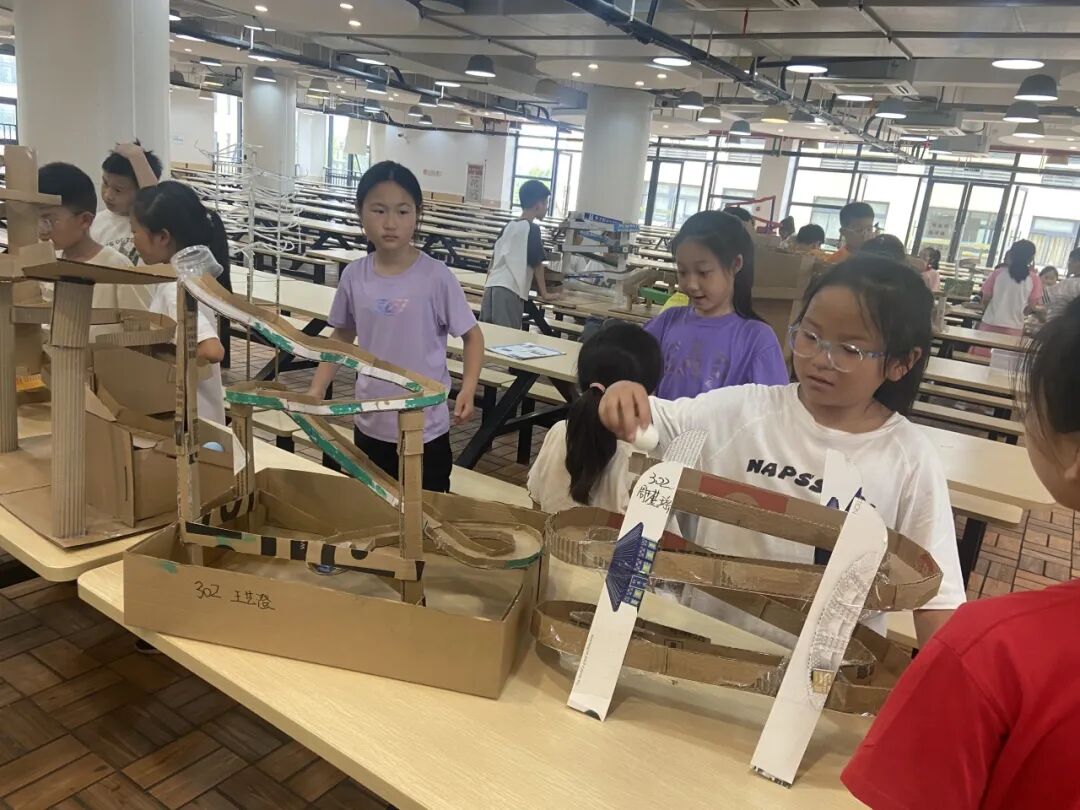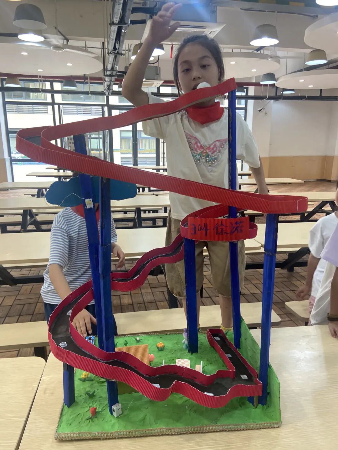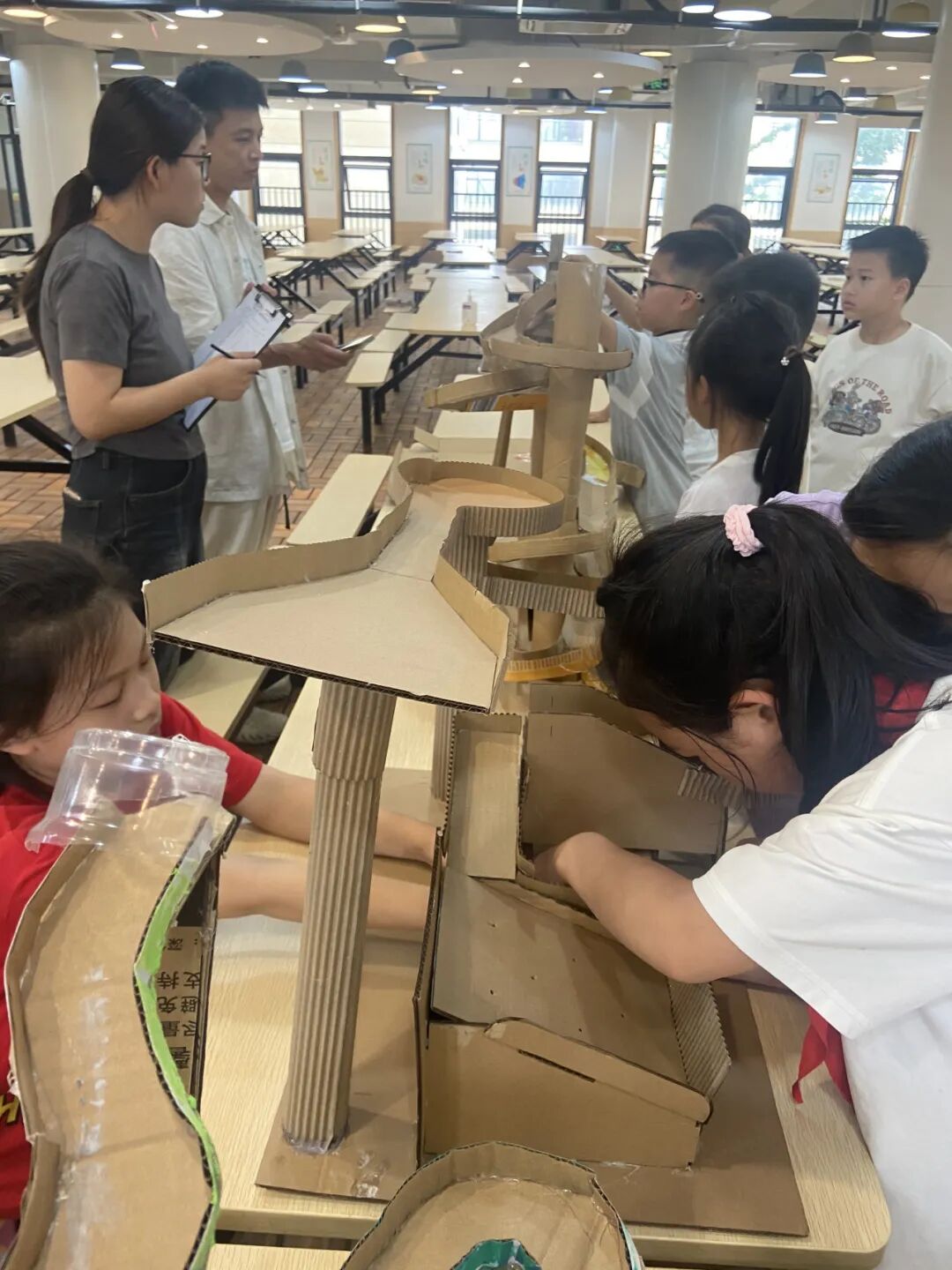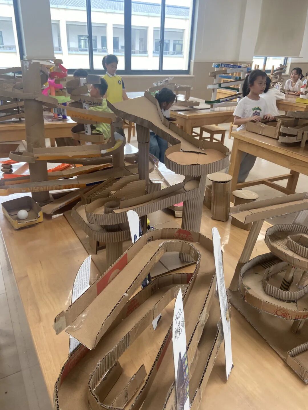 本次比赛分为初赛和决赛两个环节。三年级的学生在五一假期期间,利用家里的废旧纸箱、水管、橡胶管等材料制作了各种各样的创意轨道,并将小球运行的视频上传至班级群。通过对运行时间、结构制作等方面进行评价,最终选出了48个作品参与决赛。