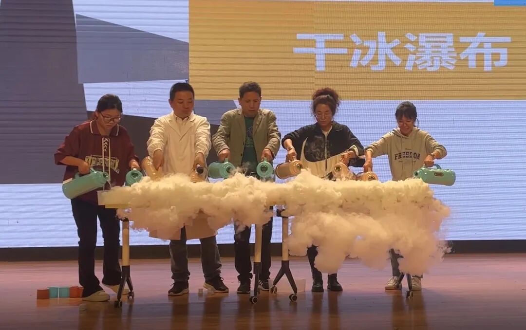 最后,以一场“干冰瀑布”作为压轴,为科学节的开幕式画上了完美的句号。当大量干冰遇水释放出滚滚白雾,仿佛置身仙境一般,营造出一个神秘而美丽的场景。这不仅让孩子们直观感受到干冰升华的物理现象,还激发了他们对气候变化、环境保护等话题的兴趣和思考。