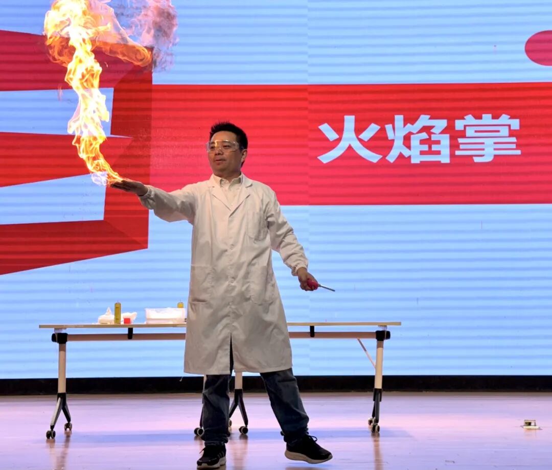紧接着的“火焰掌”表演,无疑是全场最为惊心动魄的环节。在确保绝对安全的前提下,吴老师手上涂满了防火凝胶,然后点燃了手掌上的火焰,却毫发无损。这一幕让台下观众屏息观看,通过这个实验,孩子们不仅见识到了化学物质的特殊性质,也学到了关于燃烧和隔热的知识,同时强调了实验安全的重要性。
