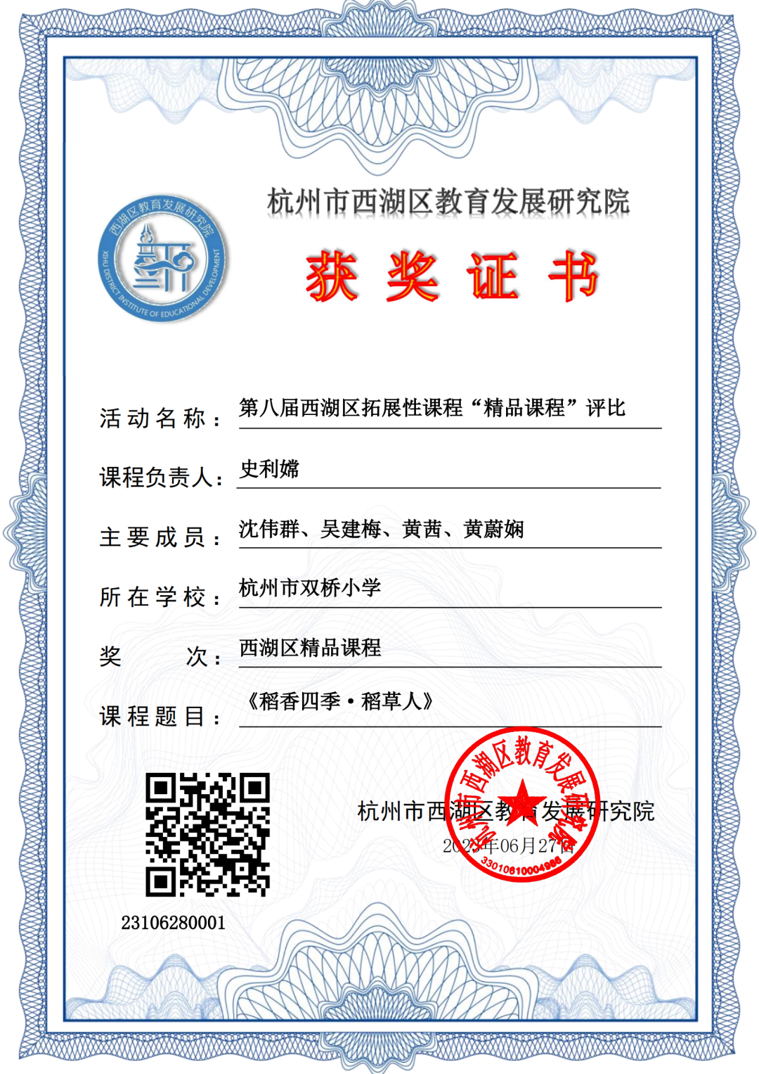 学校坐落于美丽的兰里乡村,借得天独厚的地理条件,近年来与“兰里田园学校”紧密合作,成功地开展了一系列学农活动。在这些活动中,学生们展现出了极高的热情和兴趣。为了更好地满足学生的发展需求,学校充分利用在地资源,结合自身的地理优势和种植条件,将传统的稻作文化引入校园,并开发实施了《稻香四季·稻草人》这一课程。该课程在2023年荣获区、市精品课程荣誉。