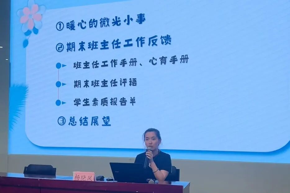 最后郑影竹副校长与班主任们进行了反馈总结。郑校长肯定了这一学年老师们的辛苦付出,并与大家一同回顾了一学期来班主任们的暖心微光小事,点赞了年级组长们尽心尽力的工作,反馈了期末班主任工作的情况。