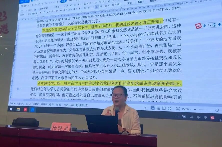 此次总结会议,我们很荣幸邀请到了杭州市学军小学的高级教师,浙江省班主任工作室领衔人、浙江省十佳智慧班主任杨晓凤老师为我们做讲座。杨老师从一个学生的成长自传入手,和我们分享了自己作为班主任,如何通过自主协调座位、结对书信交流、创意家长会等活动为一个孩子成长带来助力的。接着杨老师为我们带来了《家校沟通6w—让教师与家长沟通666》的讲座,杨老师强调我们要用发展的眼光看待孩子,也要讲究沟通艺术,以真诚换真诚,要善于倾听和热忱帮助家长。