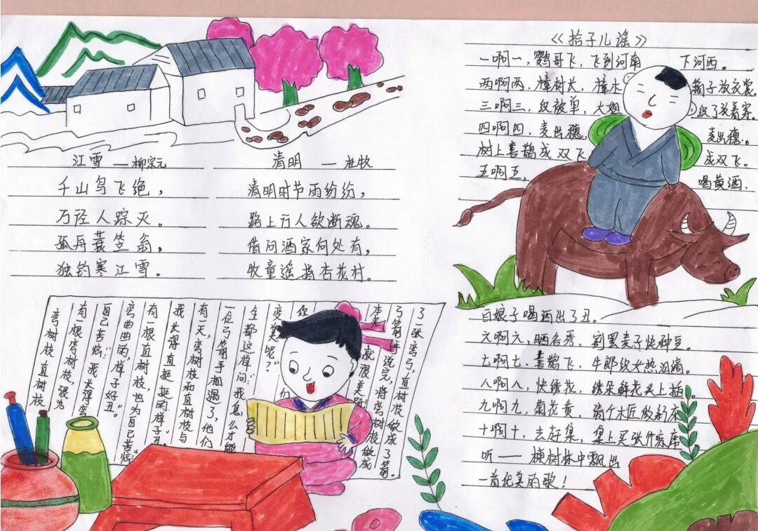此次诗配画的作品征集得到我校美术科的配合和支持。自古以来,诗画是一家,诗中有画,画中有诗可谓是一种至高无上的境界。同学们将自己体会到的诗的意境、情感,变成生动形象的图画。诗与画的相遇,让我们看到了同学们的童心巧手,感受到了作品中的诗情画韵。
