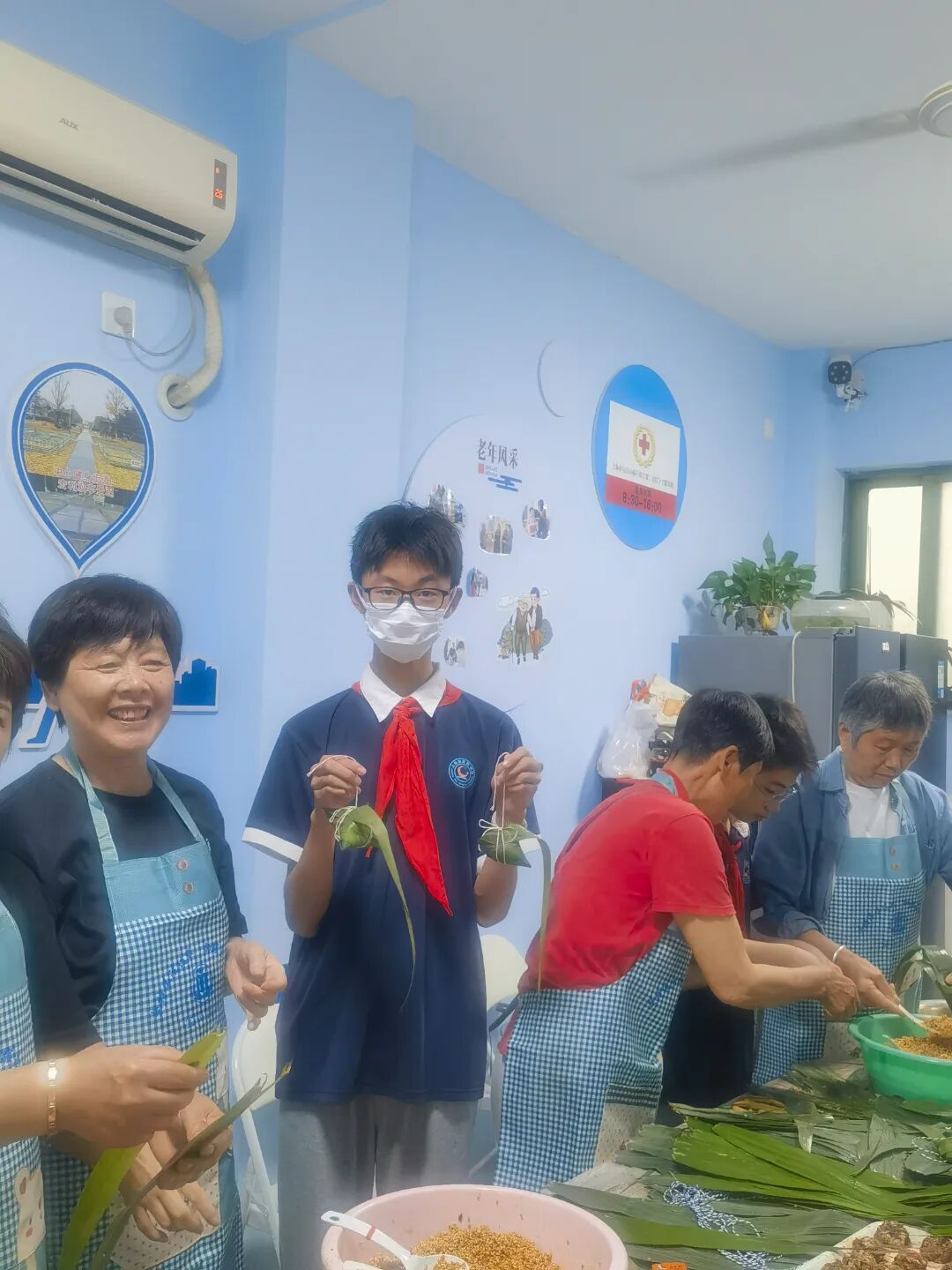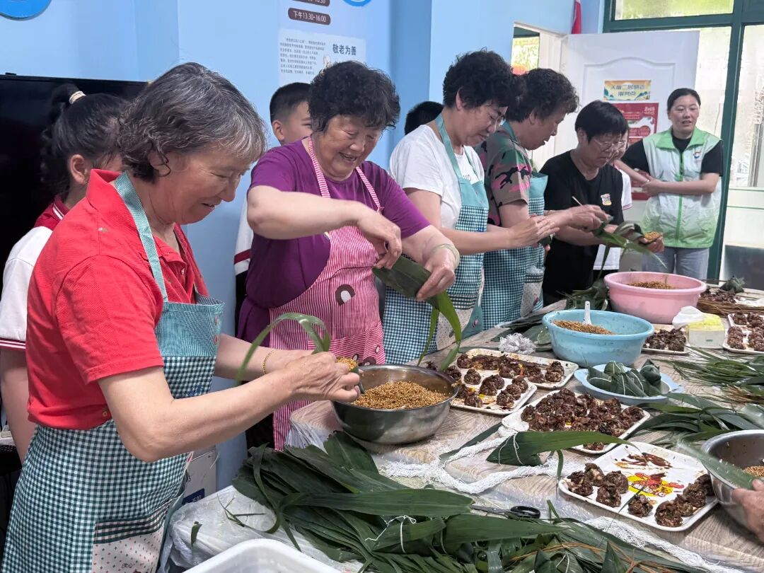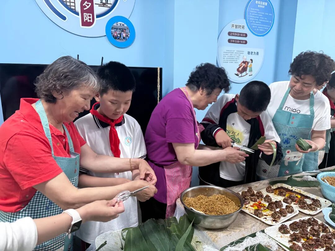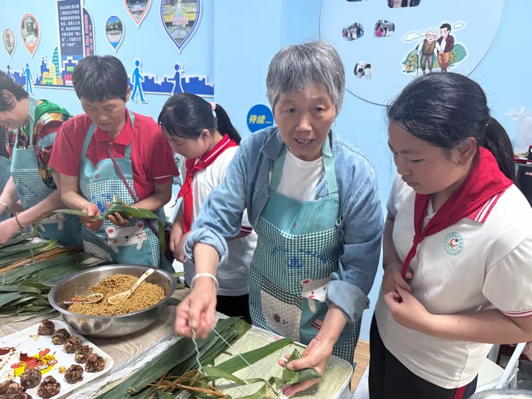 同学们兴奋地向大家展示着自己的粽子。看到这一幕,社区的阿姨奶奶们也露出了高兴的笑容。