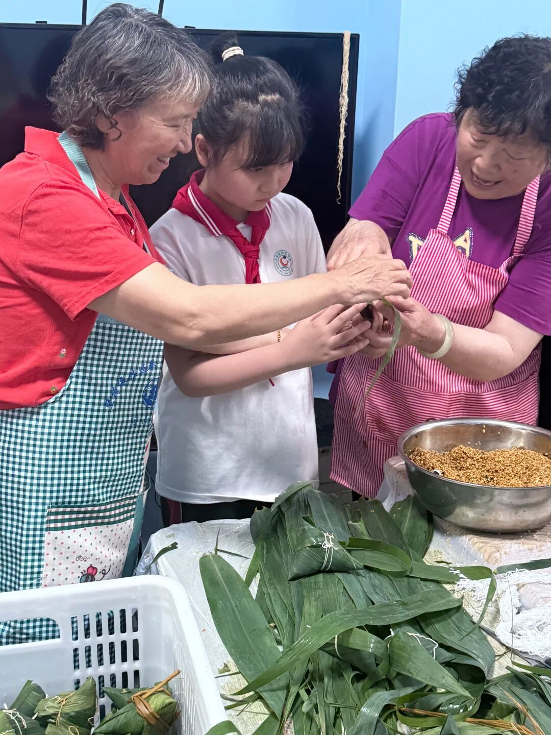 折叶、盛料、压实、裹叶、扎绳……同学们在奶奶们的指导下,兴奋地学着包粽子的手法。一双双忙碌的小手穿梭在一张张翠绿的粽叶间,一道道工序有条不紊地进行着。
