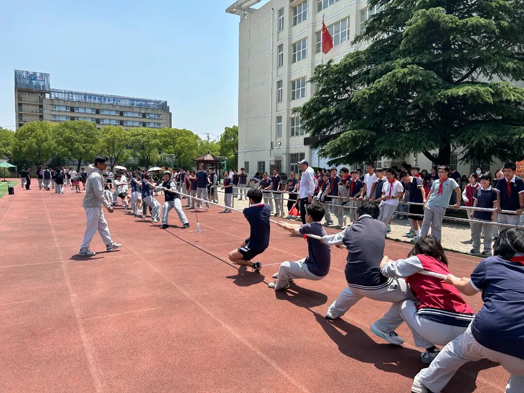 拔河则是中学部的传统项目。随着一声哨响,麻绳两端的队伍像两尊紧绷的雕塑,每一块肌肉都迸发出无尽力量。选手们双脚深深扎进地面,鞋底与塑胶跑道摩擦出刺耳的声响,与赛场边此起彼伏的呐喊声交织成激昂的乐章。