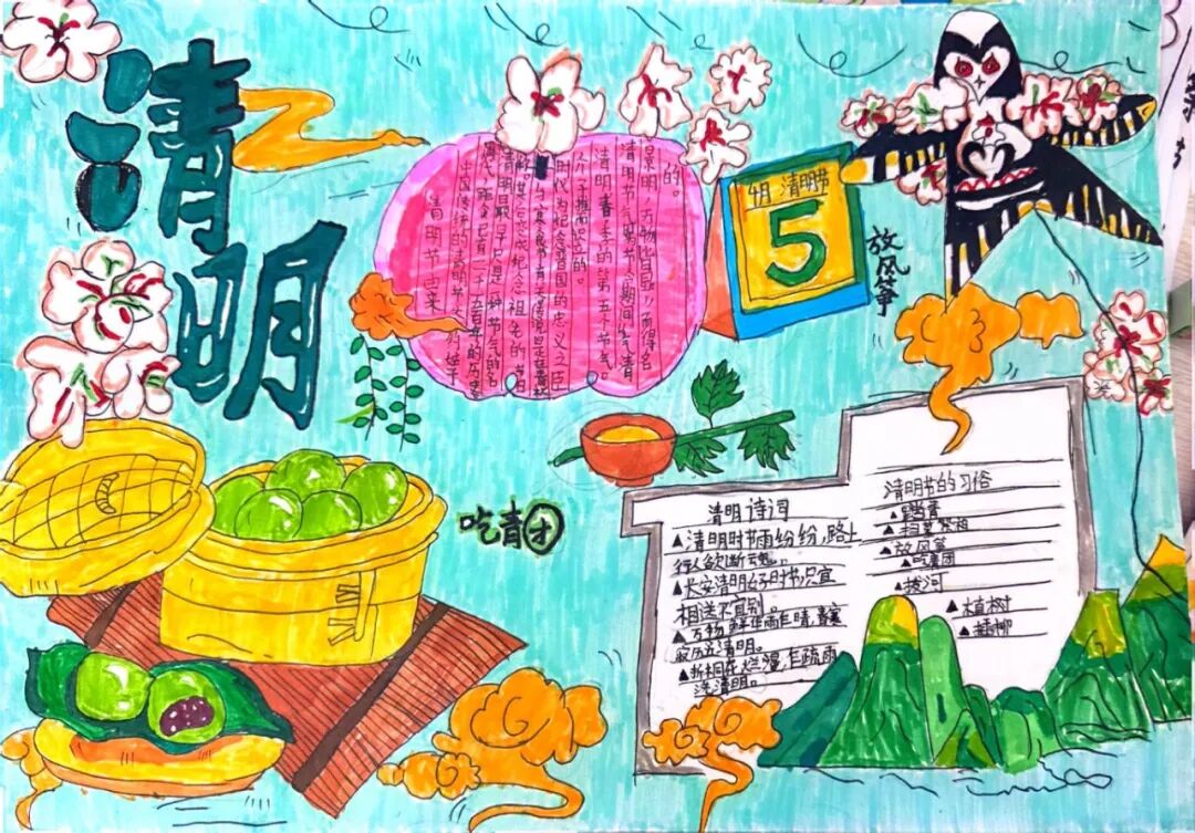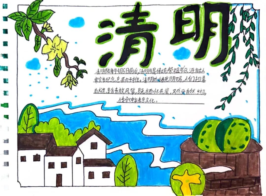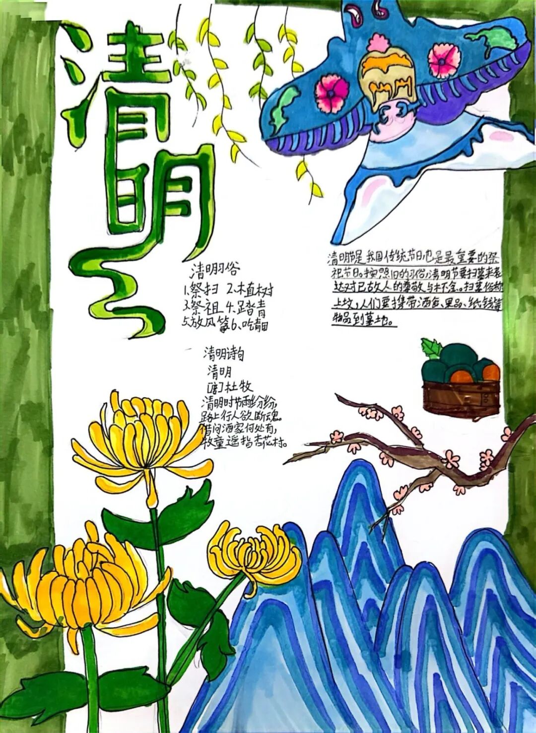 三年级队员们在书画创作环节中纷纷提笔挥毫。有的以“清明雨景”“春柳踏青”为主题,绘制清新淡雅的水墨画,展现清明时节的自然之美;有的书写《清明》古诗,一横一竖间尽显对传统文化的热爱;有的用图文并茂的形式介绍清明习俗,传递文明祭扫、绿色清明的理念。
