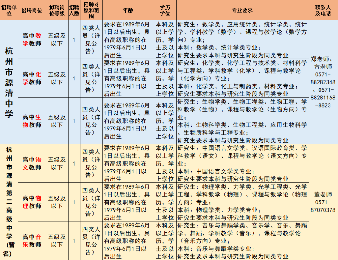 杭州市源清中学、杭州市源清第二高级中学2025年6月批次公开招聘专任教师6名,涵盖语文、数学、物理、化学、生物、音乐等学科。