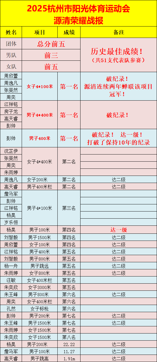 骄阳淬炼体魄,赛场见证锋芒!2025年杭州市区高中阳光体育运动会圆满落幕,源清中学运动健儿以热血之姿、拼搏之魂,在赛场上书写传奇!我校运动健儿共打破3项纪录,斩获多项殊荣。男队在激烈角逐中跻身总分前三甲,女队亦表现非凡,稳居前五强。尤为值得一提的是,我校团体总分高达229分,在51支参赛劲旅中名列前茅,创历史最佳战绩!以强大实力闪耀杭城,用青春汗水诠释了"更高、更快、更强"的体育精神!