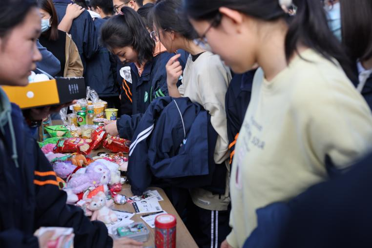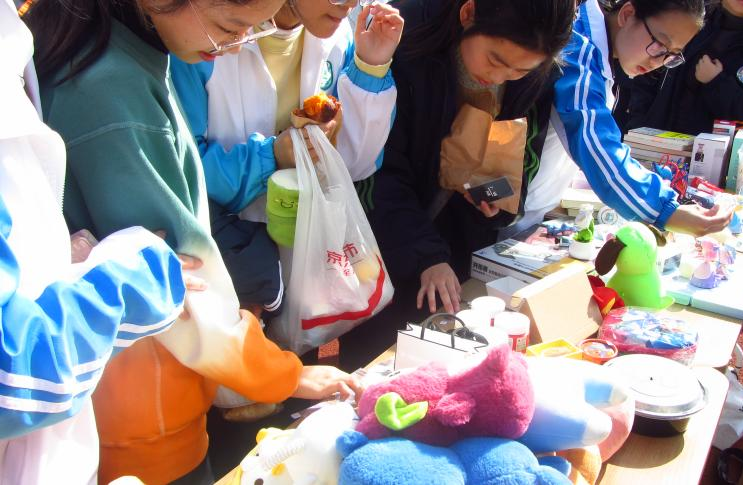 跳蚤市场一开幕,同学们便纷纷涌入义卖现场。活动开始仅五分钟,各班商铺周围便围满了同学们,若不踮起脚尖我难以看到商铺上的一丝一毫。更有才艺的同学们毫不吝啬地展示着自己的风采。在同学们热情的背后,更我看到的是我校同学们对新疆阿克苏地区生活贫困却仍热爱学习的同学们的温情关怀。