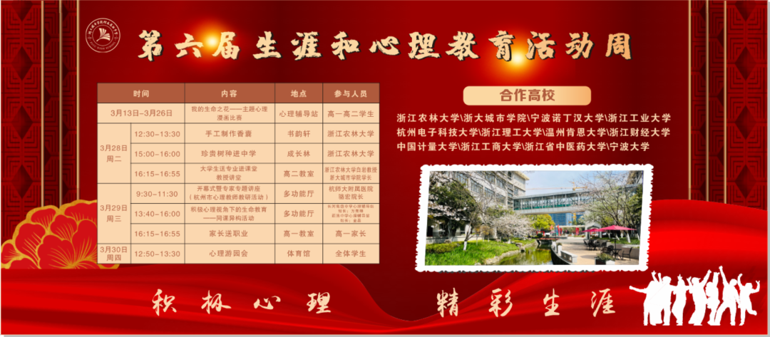 2023年的生涯周活动可谓精彩纷呈,不仅有专家送报告、教授大学生送专业、家长送职业、学长送经验等传统活动,还有生涯研讨、同课异构、生涯探游等系列活动,另有心理漫画大赛、手工香囊制作等趣味活动,紧扣“智慧创新、个性发展”的办学特色,引导学生能主动、智慧、持久地适应社会,实现自我发展与终身发展。