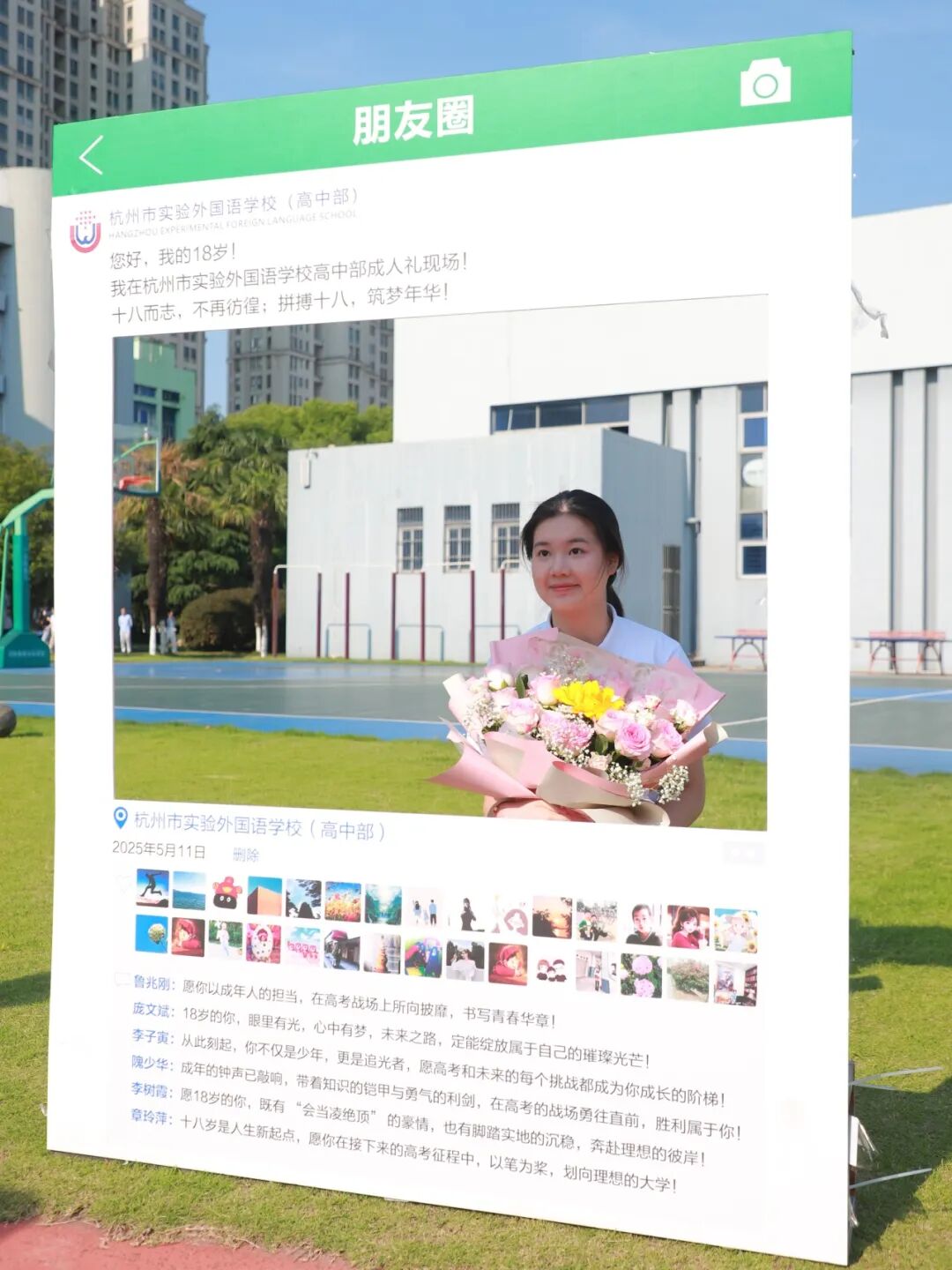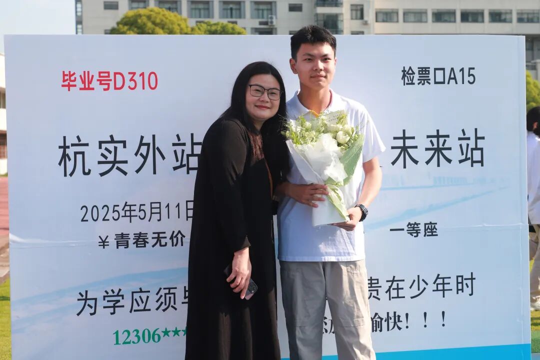 校园里,每一处细节都诉说着深情。印有 “杭实外站 — 未来站” 的创意高铁票,承载着母校对学子奔赴远方的殷切期许;高三学子的童年照片牌,串联起青涩往昔与蓬勃今朝;仿真设计的 “18 岁朋友圈” 互动装置,定格青春绽放的珍贵瞬间。这些独具匠心的小品装饰,将学校对高三学子的祝福与牵挂,编织成温暖而美好的成长礼赞。