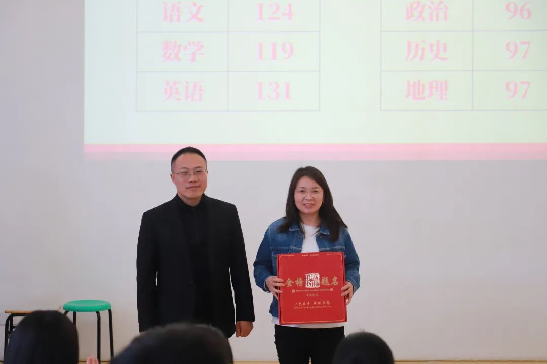 随后,执行校长鲁兆刚、学生发展中心主任隗少华、高三年级班主任等上台为在 “二模” 考试中取得优异成绩的学生颁发奖品。这些优秀学生是全体高三学子学习的榜样,激励着大家在最后的 50 天里奋勇拼搏。