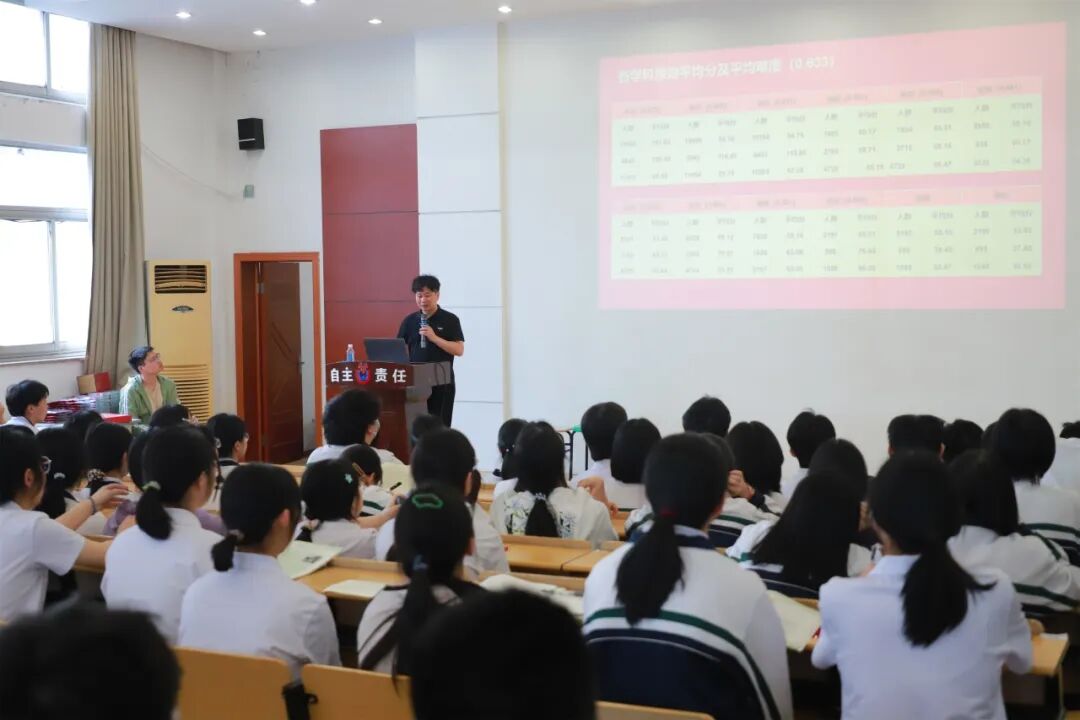 高三年级主任李子寅以杭州市市区 “二模” 成绩数据为参照,与本校学生数据展开了全面且细致的比对分析。在分析过程中,他通过详实的数据图表,清晰直观地呈现出各班级、各学科的成绩态势。他强调,接下来同学们需针对自身薄弱环节进行重点强化,切实提高复习的针对性与实效性,力求在高考冲刺阶段实现成绩的稳步提升。