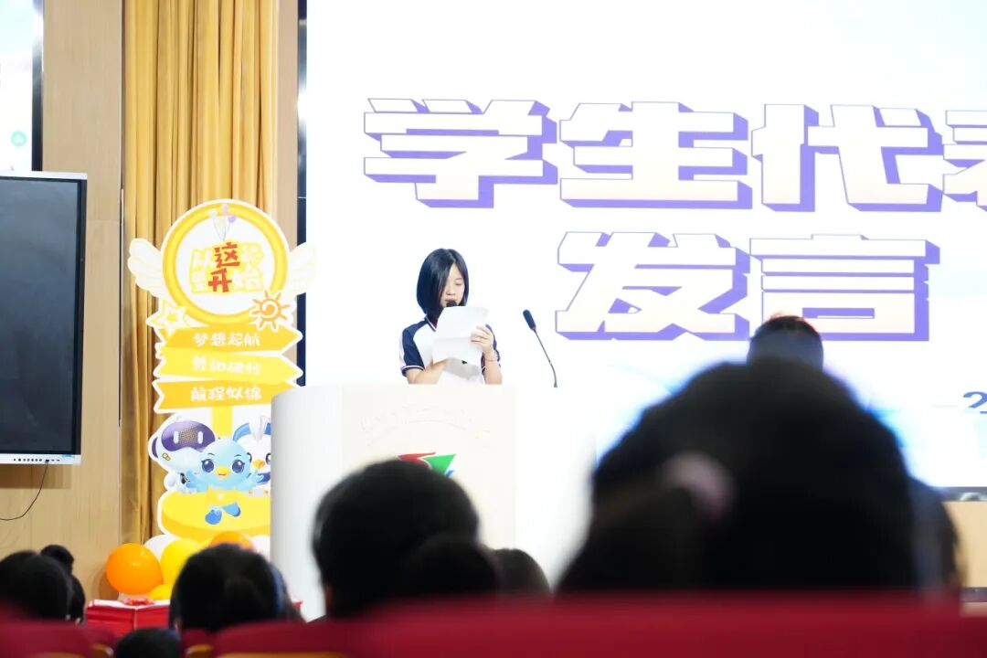 初三(20)班王心瑶同学代表初三全体学生上台发言。款款深情,道出毕业生们的共同心声:三年来,我们与学校风雨同舟,荣辱与共,一齐走过了千百个日日夜夜;三年来,我们与老师朝夕相处,有太多太多的人和太多太多的事值得我们永远回味和珍藏。祝贺我们在2024的盛夏,毕业了!