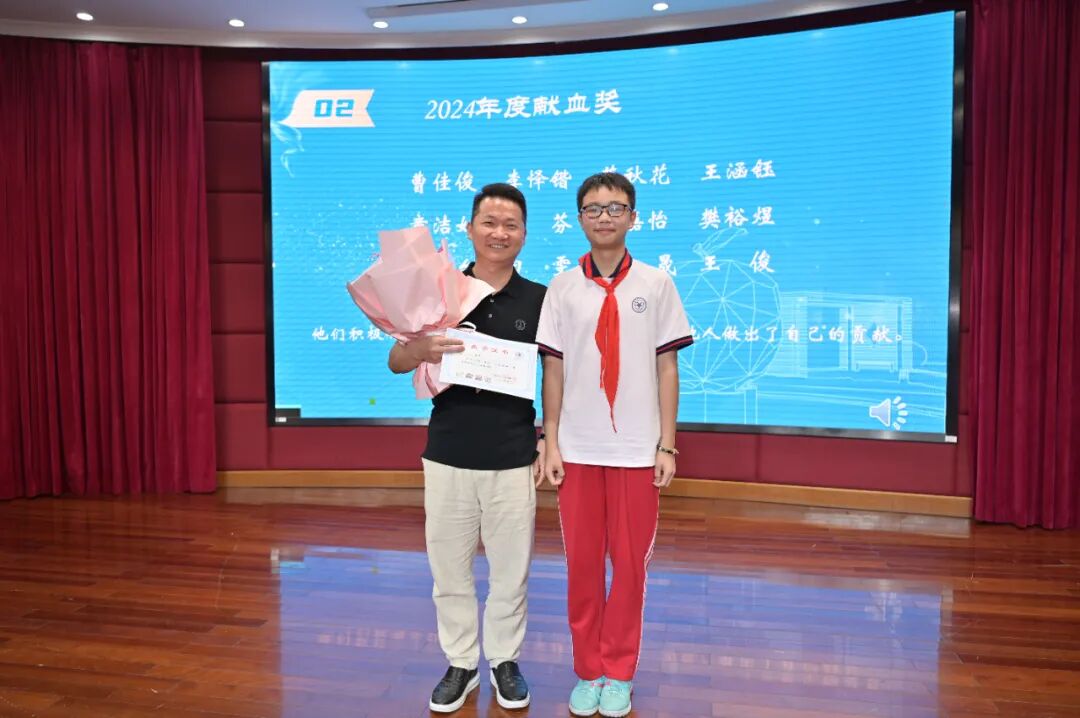 教师是学生的榜样,在2024献血活动中,我校12位老师献出了宝贵的鲜血,体现了伟大的人道、博爱、奉献的红十字精神。其中曹佳俊老师献血六次,学生向他献花致敬!