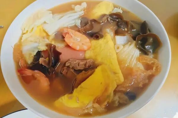 杭三鲜虽名为三鲜,实为多鲜,是虾、肉丸、猪肚、肉皮加上黑木耳、笋片、青菜等同锅烹制炒制。名副其实的多鲜大菜。肉皮柔软,丸子鲜嫩,清香爽滑,菜品丰盛,滋味多样,柔软滑嫩,香鲜可口。