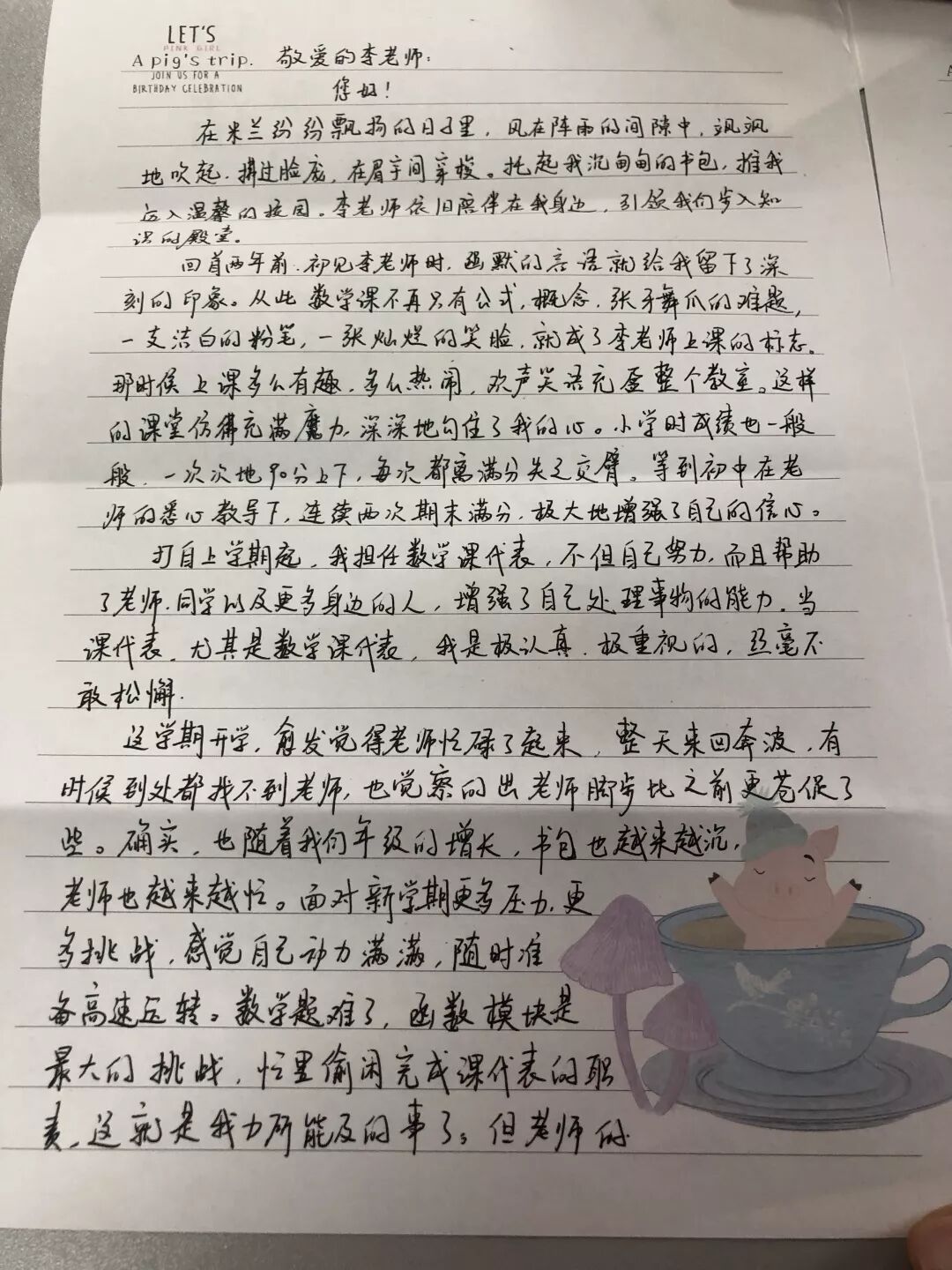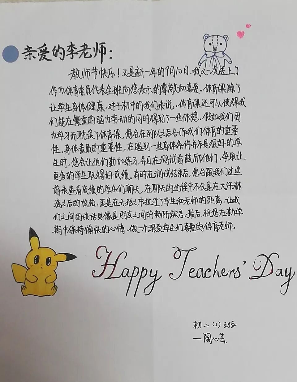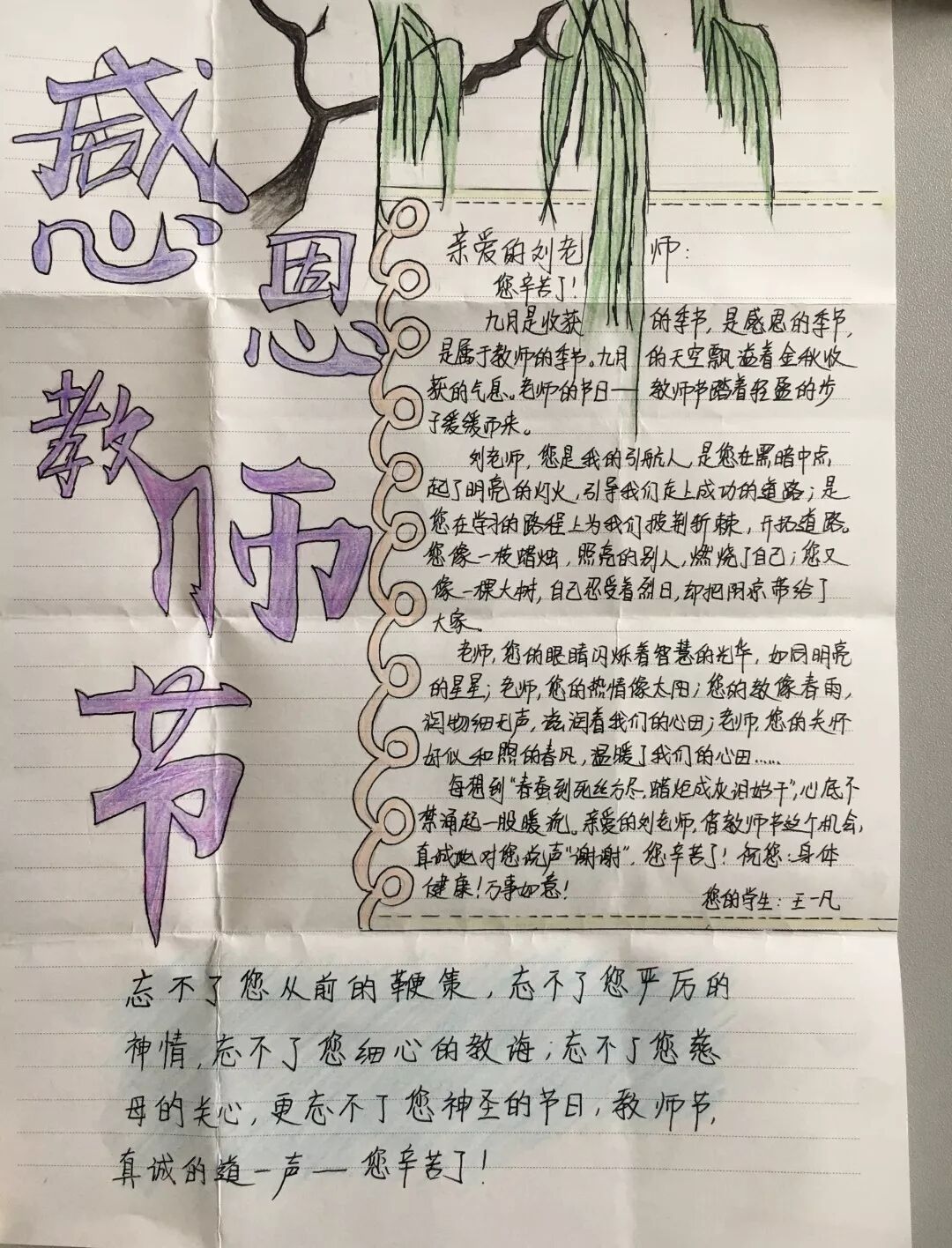 亲爱的老师,您好吗?现在的您,是否在灯光下,为我们批改作业呢?您一直是我们学习道路上的一座灯塔,照亮前方的路,为我们指明方向,带我们走出黑暗。您就是辛勤的园丁,总是在背后默默付出,不计回报;在您的栽培下,我们健康快乐地成长。老师,谢谢您!在教师节来临之际,祝您身体健康,万事如意,永远18岁!