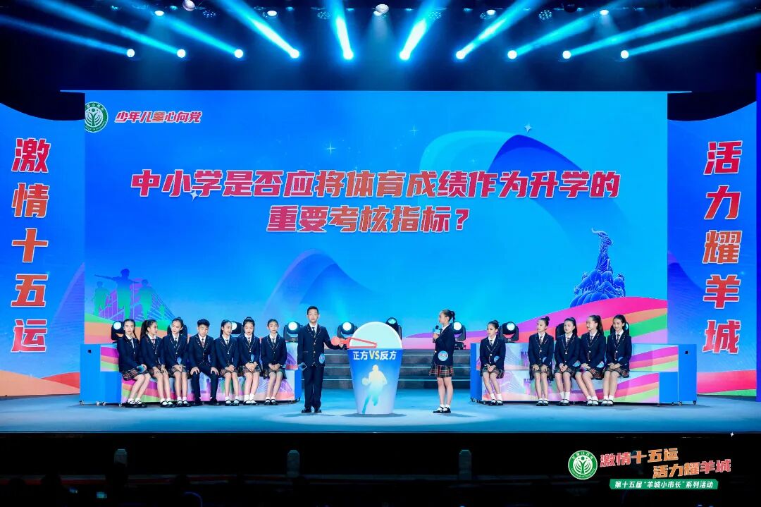 在这一环节,皮梓彤同学与其他四位羊城小市长候选人、往届羊城小市长组成团队合作,通过情景剧表演、演讲等方式,以“彰显一座城”为主题,提出安装摄像头和传感器,加入智能算法,利用科技手段,解决“十五运”期间的交通拥堵问题,展现出羊城儿童的智慧和担当。