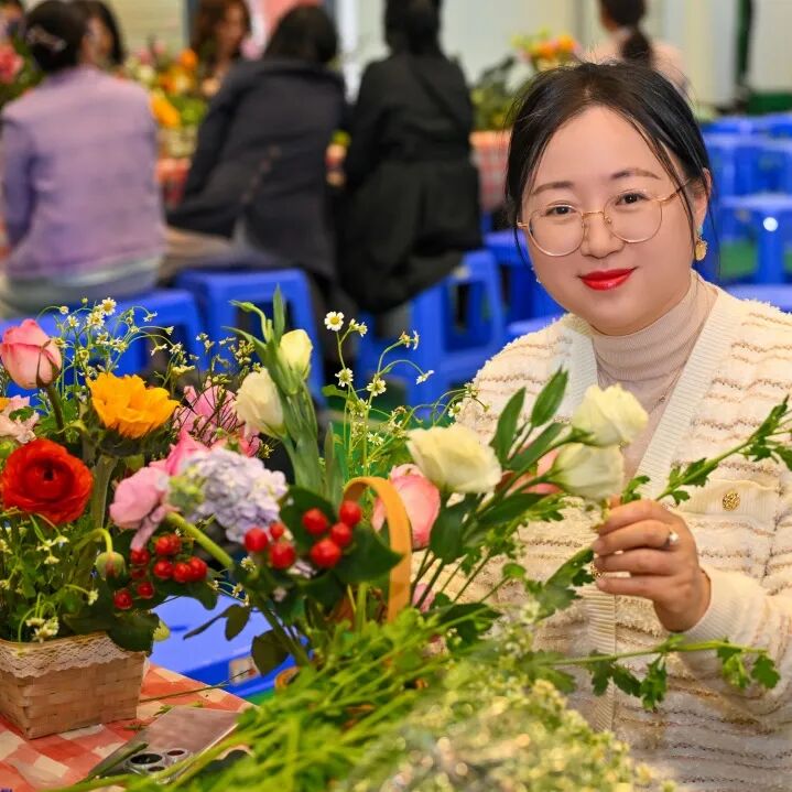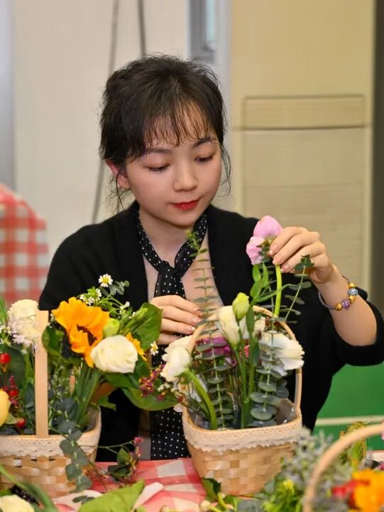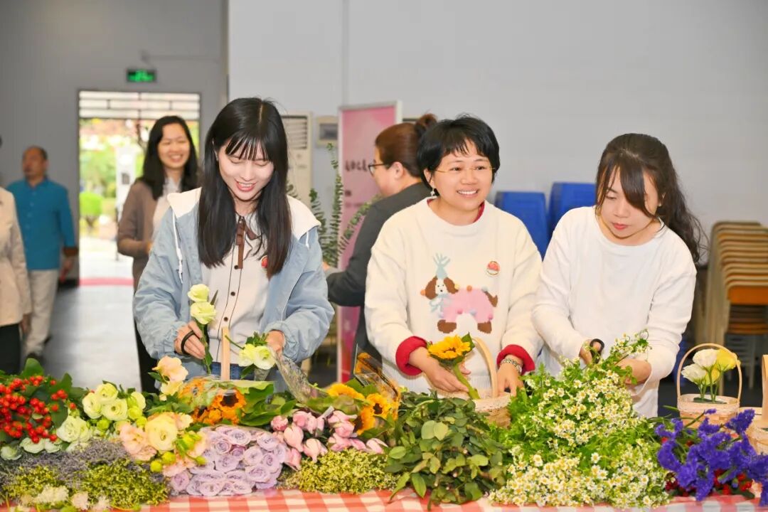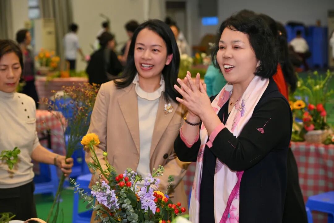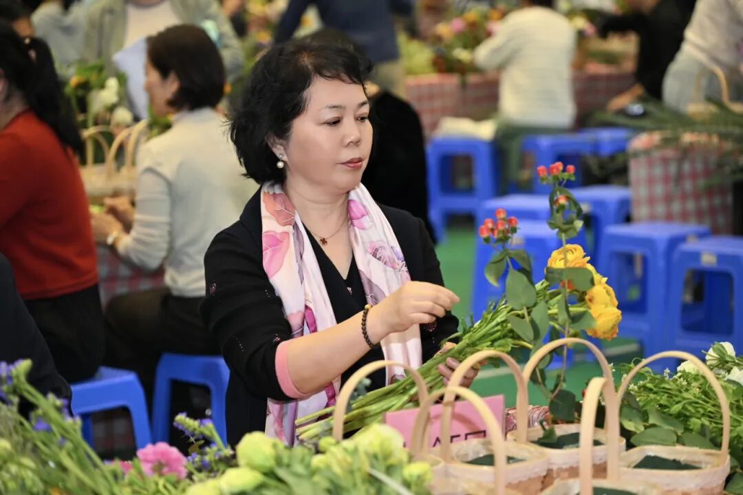 插花赛场,顷刻化作艺术殿堂!广州市中学生劳动技术学校副校长姚卫珍亲授插花秘笈,老师们巧手翻飞,玫瑰与康乃馨共舞,创意与协作齐飞。