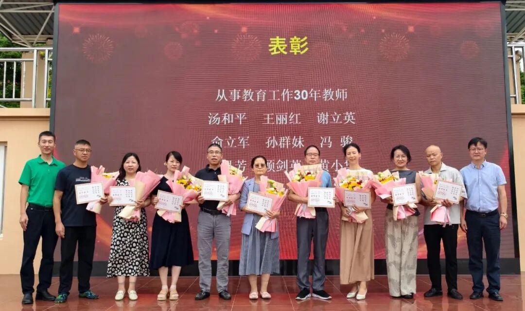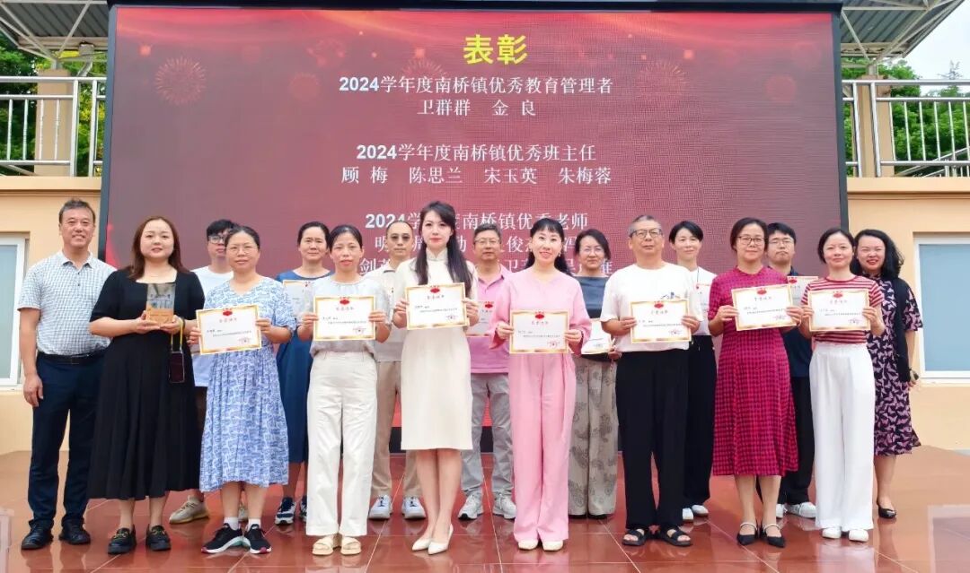 紧接着,迎来了激动人心的颁奖环节。党总支书记李永卫、副校长程银洁为荣获“南桥镇优秀管理者”“南桥镇优秀教师”“南桥镇优秀班主任”“奉贤区和润贤师·师德榜样”称号的教师们颁奖。他们用辛勤的汗水和卓越的智慧,在教育的舞台上绽放出耀眼的光芒,是全体教师学习的榜样。随后,校长杜德生、副校长、工会主席屠长江为在教育岗位上默默耕耘三十年的教师们颁发荣誉证书。他们三十年如一日,坚守在教育一线,用青春和热血书写着教育的传奇。学生代表手捧鲜花,怀着崇敬之情,将鲜花献给这些可亲可敬的老师们,表达对他们的深深感激与美好祝福。