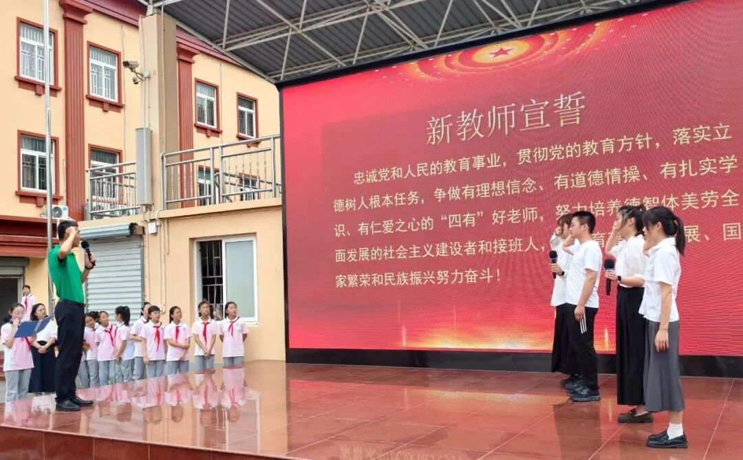 在庄严的氛围中,校长杜德生作为领誓人,带领华亭新入职教师高举右拳,庄严宣誓。那一声声铿锵有力的誓言,如同一股强大的力量,回荡在校园的每一个角落,彰显着新时代教育者勇担使命、砥砺前行的坚定决心。