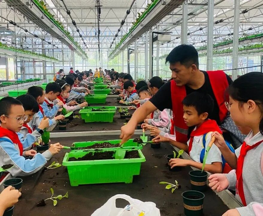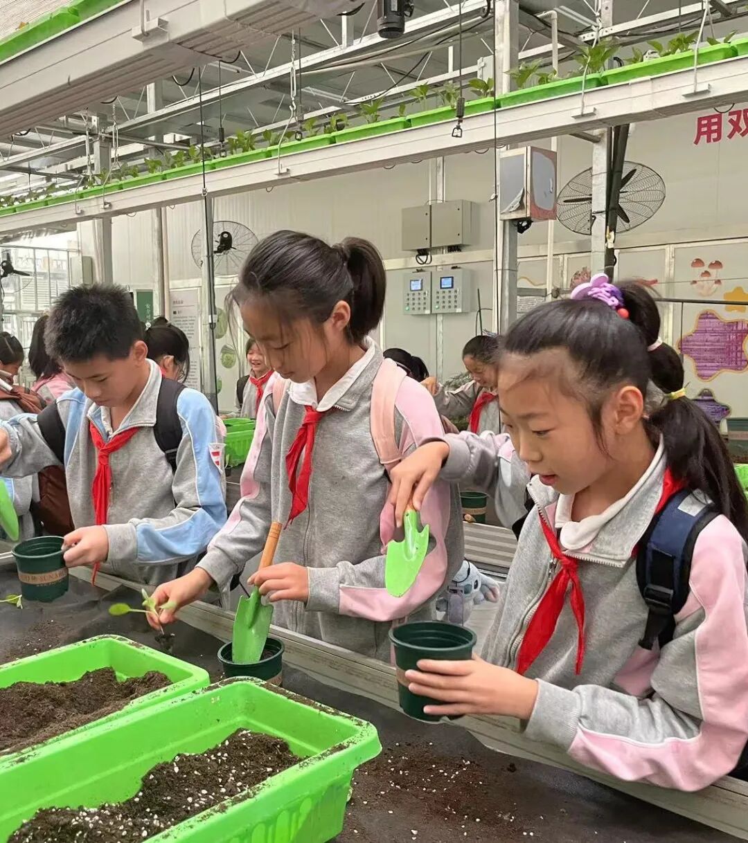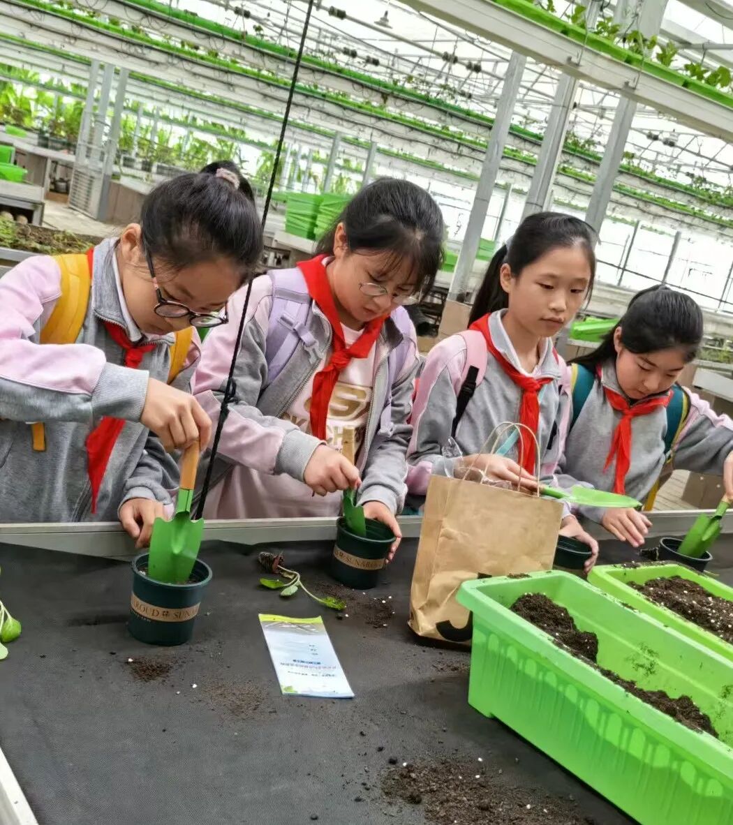 接着学生们转战蔬菜种植区,这里等待着他们的是一项全新的挑战。他们被分成四人一组,动手种植豆苗,亲身体验了从翻土、播种到浇水的全过程。在种植老师的悉心指导下,学生们学会了如何使用农具,如何识别适宜的土壤湿度,以及如何正确地播种和浇水。