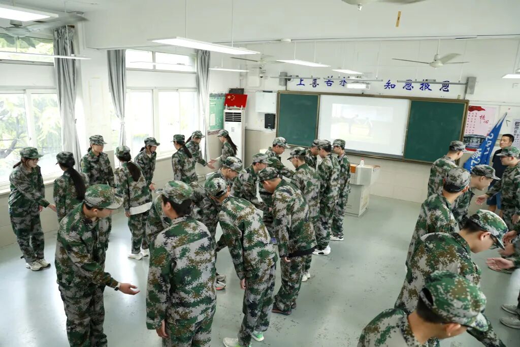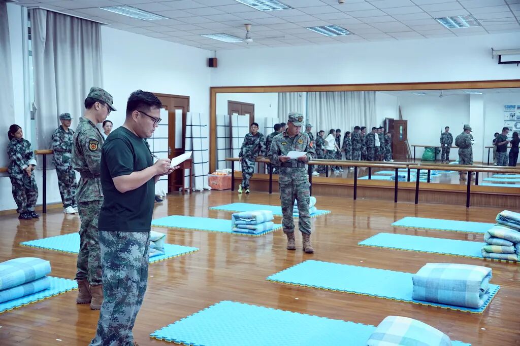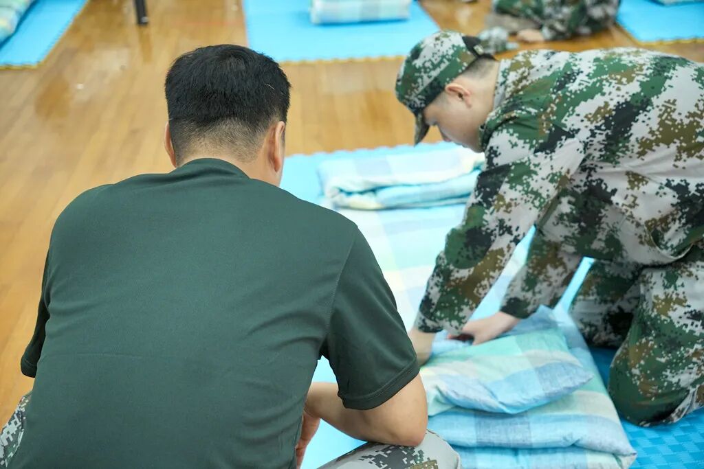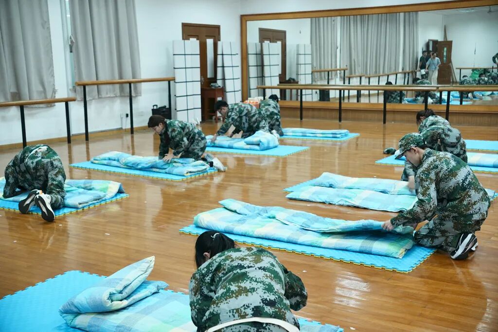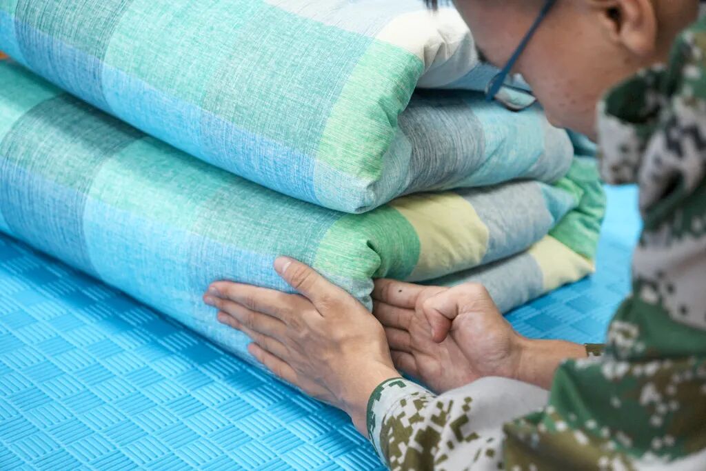 午后,叠被子竞赛在形体房开展。每班一名代表全神投入——铺平、压实、勾角、捏线,每个动作敏捷而精准。一床床“豆腐块”在巧手中逐渐成型,于方寸之间折射出严谨细致的作风。这不仅仅是一场技能比拼,更是一堂生动的纪律实践课。