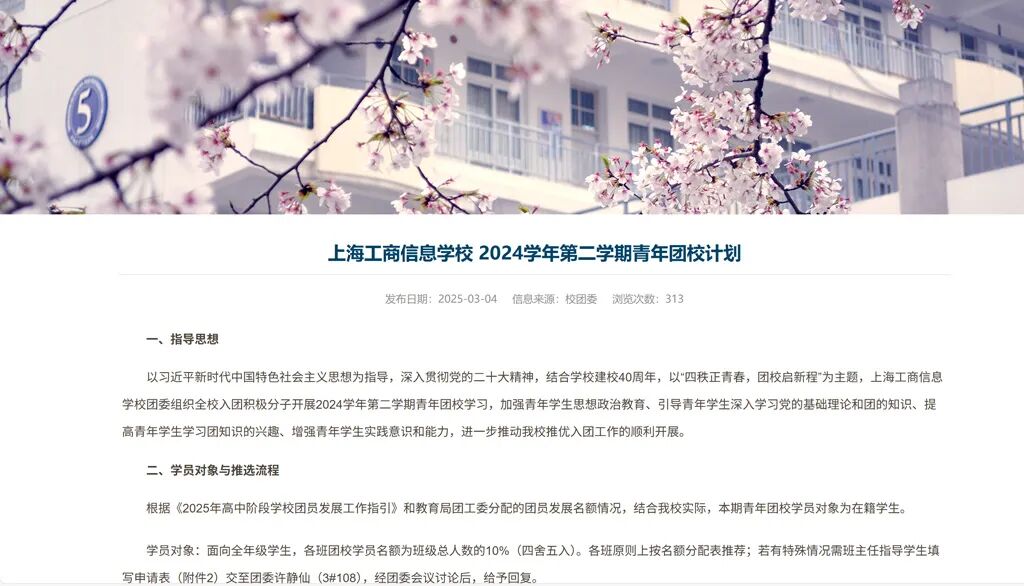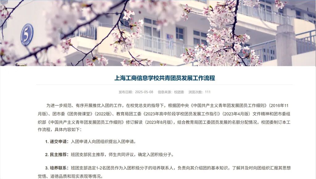 团员是共青团组织建设的核心力量。我校团委严格贯彻落实新修订的《中国共产主义青年团发展团员工作细则》,以“严把入口关、强化教育关、提升质量关”为原则,制定《上海工商信息学校2024学年第二学期青年团校课程计划》《上海工商信息学校共青团员发展工作流程》等文件,明确团员发展标准与程序,推动团员发展工作规范化、制度化、科学化,为团组织建设提供坚实保障。