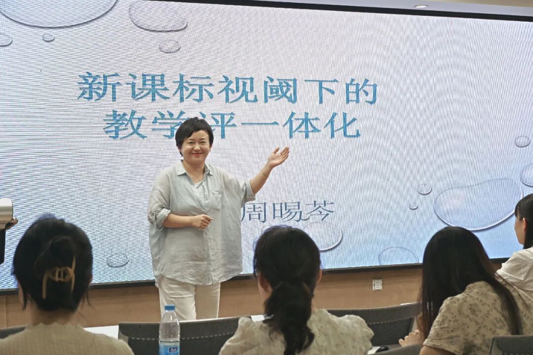 21日下午的“站稳讲台”实训从教学规范入手。教导室主任周晹芩为大家带来了 《新课标视阈下的教学评一体化》的精彩讲座。周主任指出,教育的根本在于赋予学生价值观、技能和思维能力,而学校也通过“三段两反思”、校本课程开发、单元导学案等多元平台,全力支持每一位教师的专业成长。