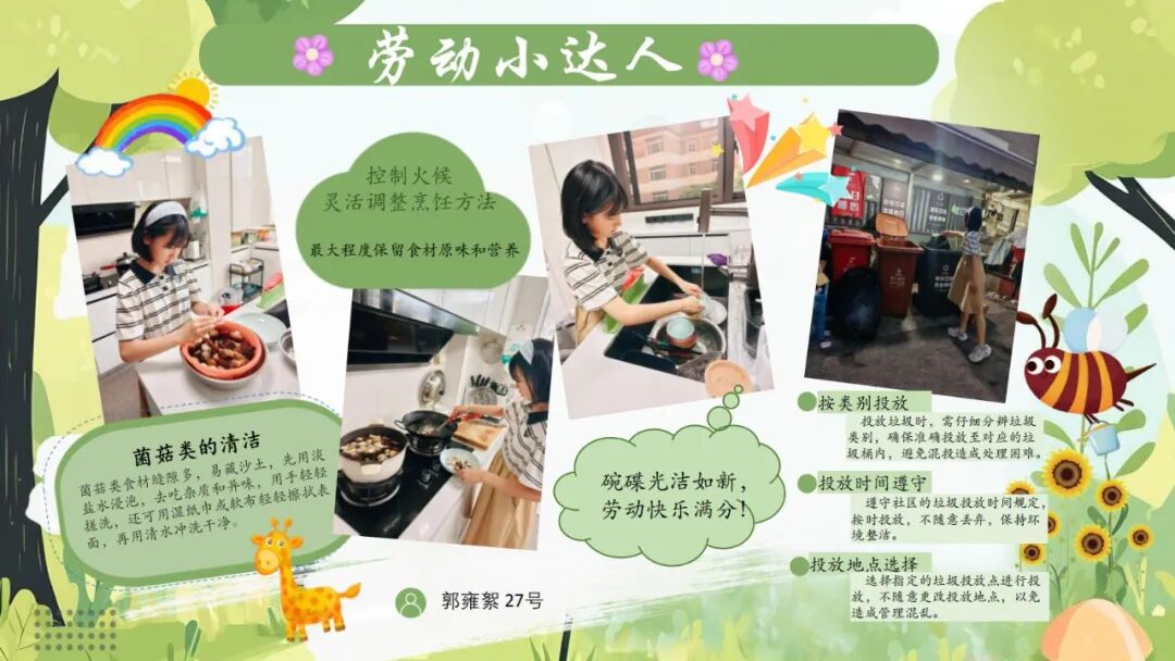 暑假里,同学们以多样的形式积极投身劳动:有的在洁净家园中挥洒汗水,有的在厨房灶台前历练厨艺,有的主动承担日常琐事…… 无论是哪一种劳动,都彰显着同学们强烈的责任意识。他们用一件件实实在在的劳动成果,为家人分担了家务重担,也在实践中逐步解锁了一项又一项新技能。在劳动过程中,同学们不仅体会到付出的价值,更深刻理解了 “尊重劳动者、珍惜劳动成果” 的意义,真切感悟到 “劳动创造美好生活” 的道理。这份沉淀于实践的认知与成长,便是劳动赋予的 “成长之乐”。