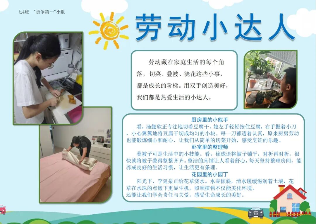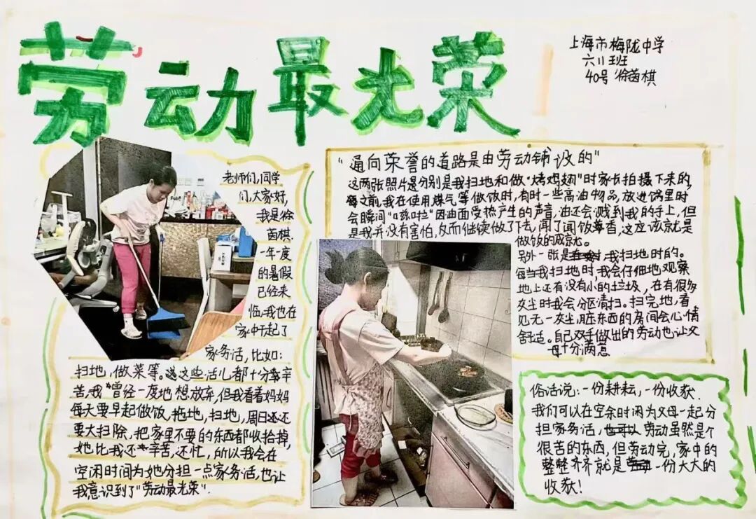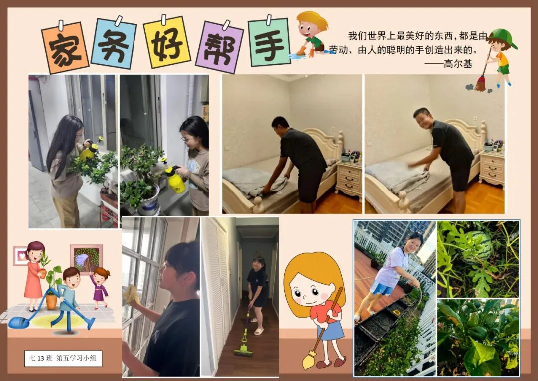 劳动,是成长的必修课,是实践的大课堂。为积极响应《关于全面加强新时代大中小学劳动教育的意见》,我校在暑期开展了一系列丰富多彩的劳动实践活动,旨在引导同学们承担力所能及的日常生活劳动,保证充足的家庭劳动时间,在实践中培养生活技能,养成良好的劳动习惯,树立积极的劳动态度。