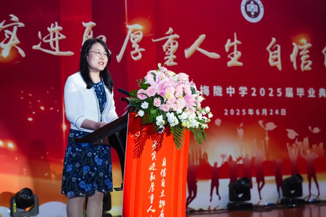 俞文静女士作为家长代表上台致辞。她回首四年,感慨孩子们从青涩懵懂蜕变为自信昂扬,在课业与实践中学会团队合作、开拓创新。她感谢梅陇中学“乐学·厚德”+“自主·通识”的教育理念与老师们的倾心培育,也珍视家校共育的温暖时光。她鼓励同学们敢想敢做敢当,将个人梦想融入家国蓝图,以实干逐梦,携母校教诲勇闯天地。