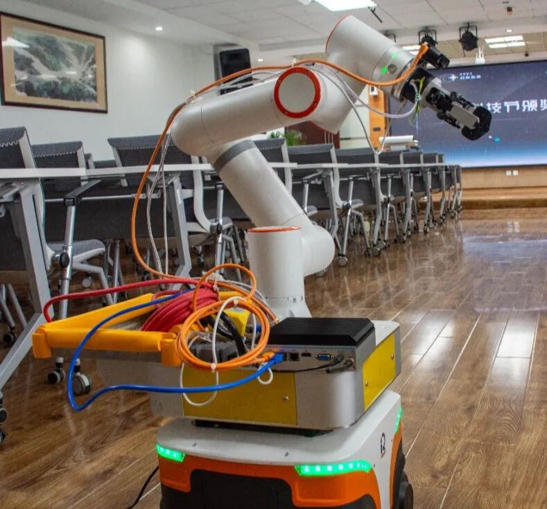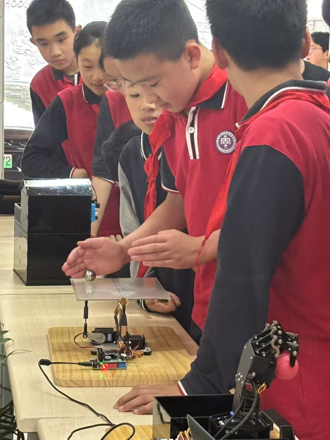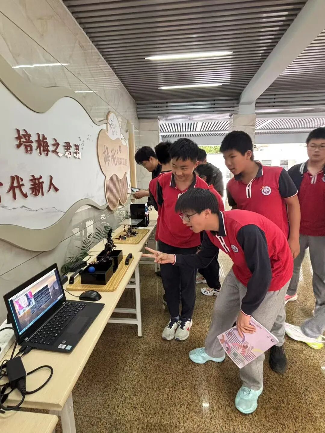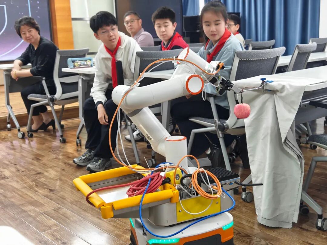 翁副校长还请出了学校人工智能机械臂表演了精准行走、摘取苹果、传递苹果等活动,同时邀请七年级赵嘉琪学生畅谈接到苹果的感想。技术飞跃,精神传承,正如牛顿从一颗坠地的苹果中获得灵感,梅陇学子也必然在科创实践中找到属于自己的创新道路。