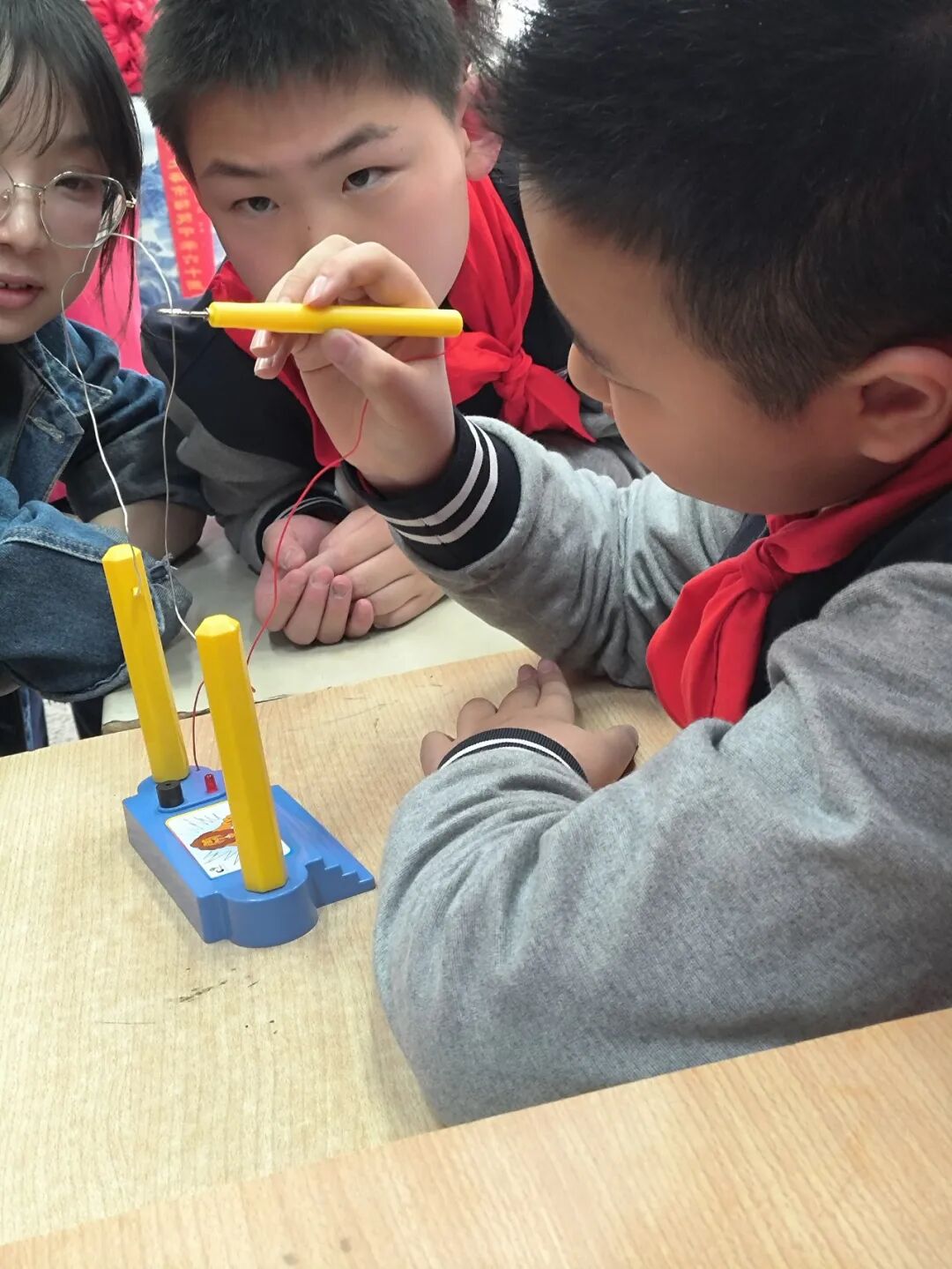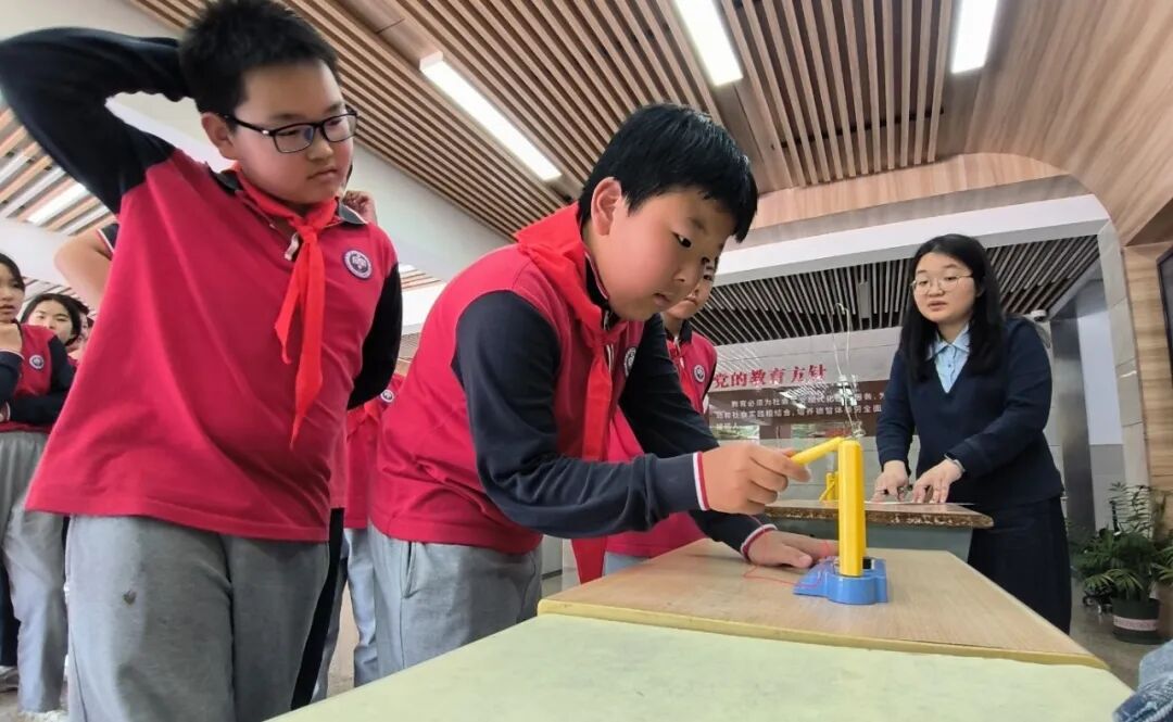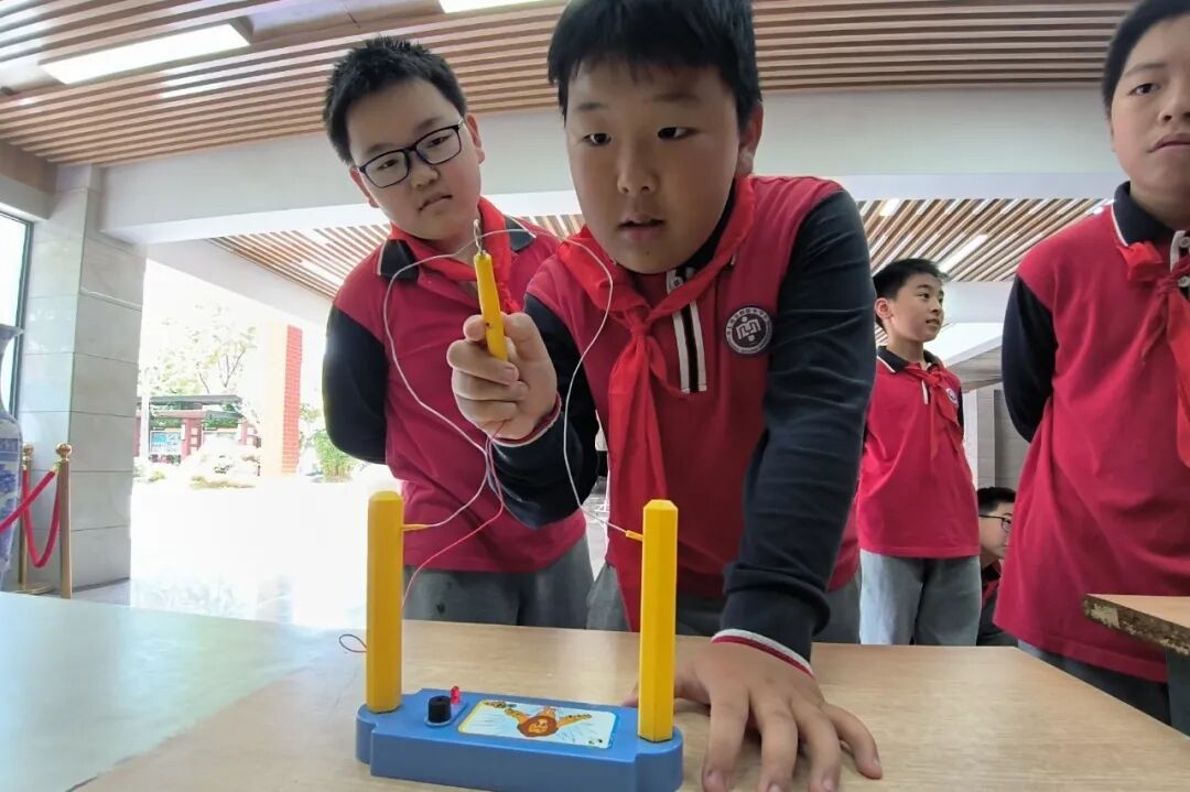 学生们巧妙利用趣味导电装置,挑战在不触碰铁丝边缘的情况下完成任务,上演了一场别开生面的头脑OM现场秀。