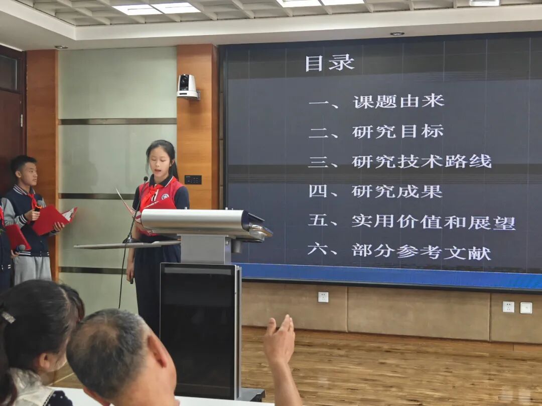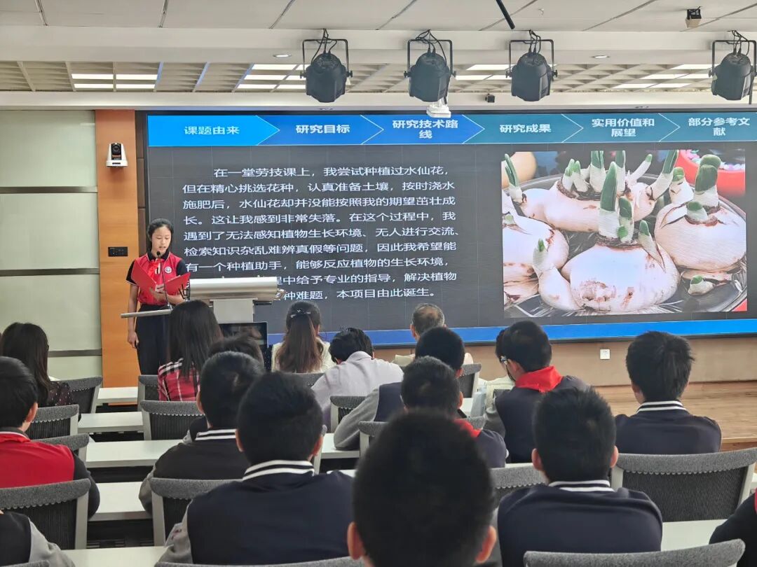 八年级李妍洁学生以“智能硬件养护水仙花”项目为例,讲述从传感器调试到数据优化的科研历程,展现“小科学家”的严谨与创意。