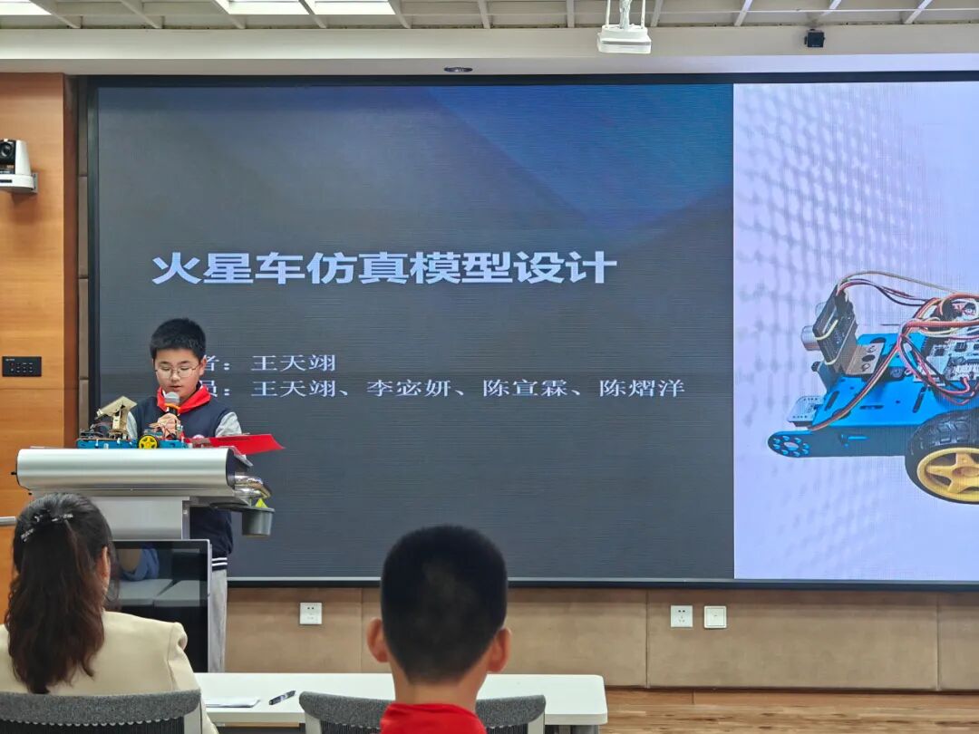 王天翊的“火星车仿真模型设计”还原火星车在极端环境中的探测过程。从机械结构到自主导航系统,每一处设计都凝聚着对深空探索的敬意。当模型的车轮碾过模拟火星地表时,人类跨越星际的梦想正被具象化。