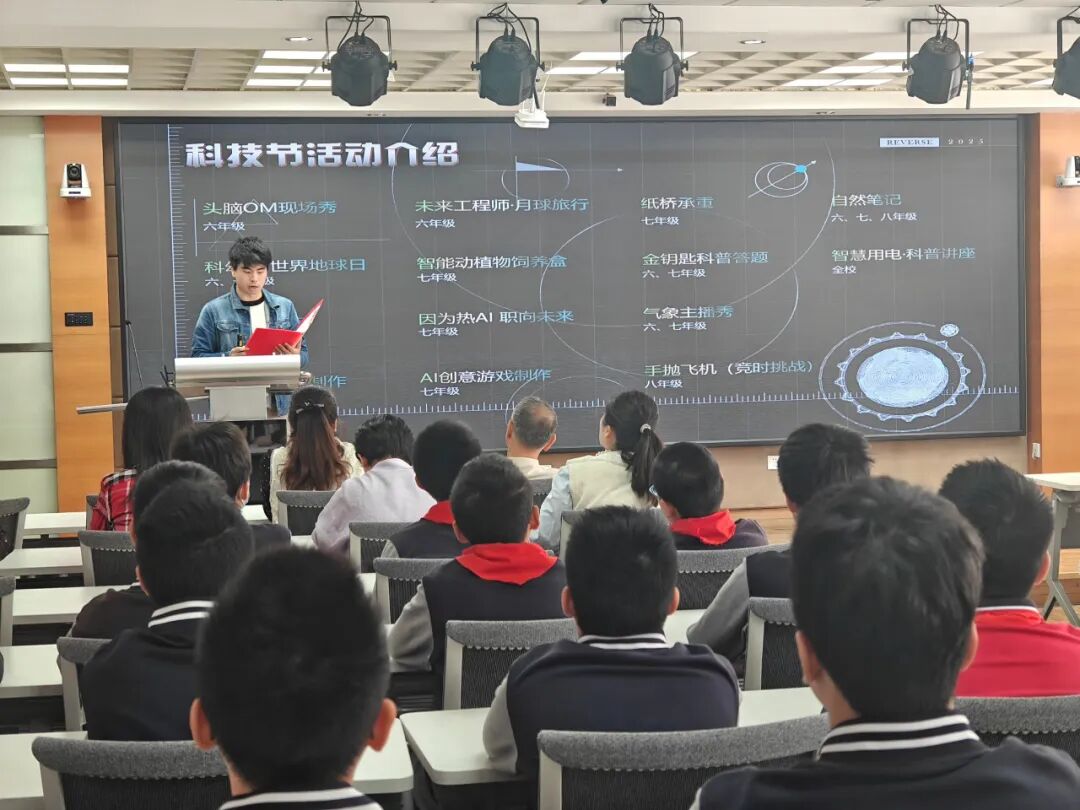 校科技总辅导员周嘉麒老师详细介绍了本届科技节的活动项目,号召学生们积极参与活动,探索科学,发现科学,创造更多的科技成果。