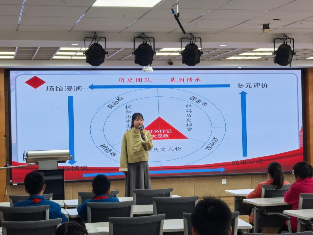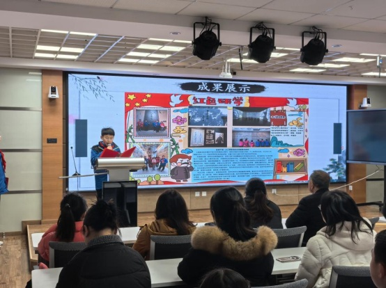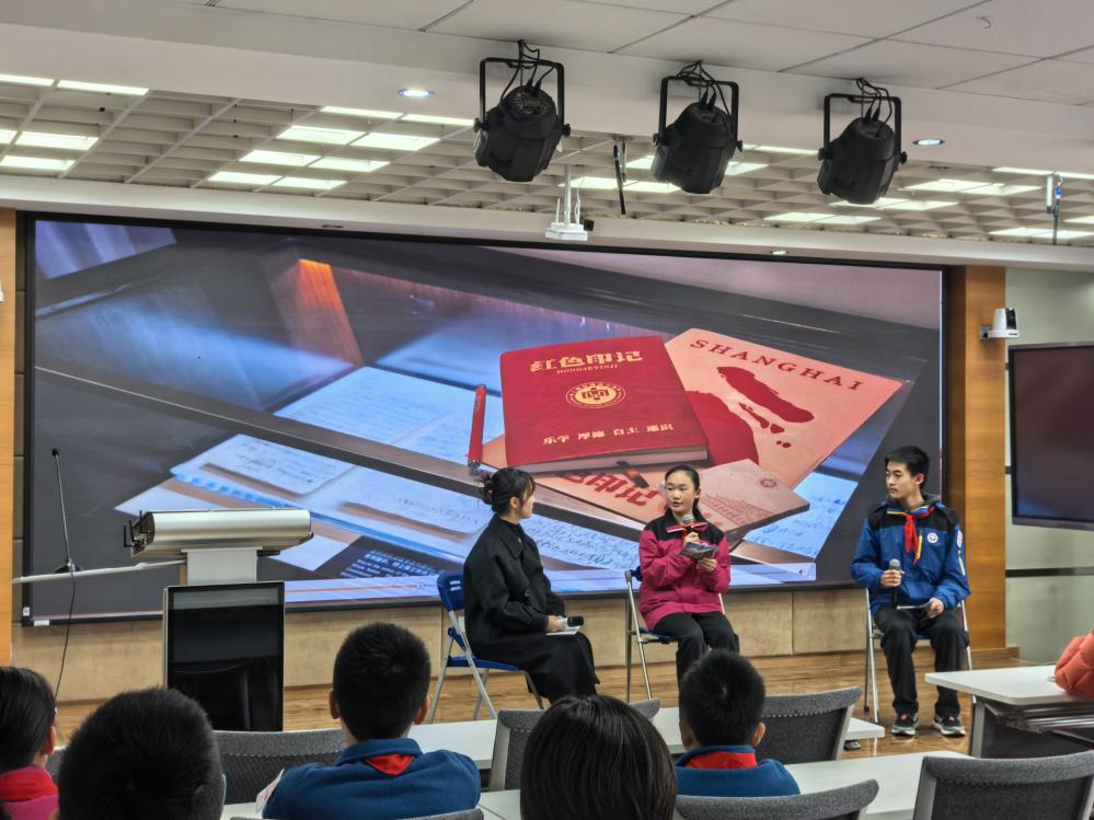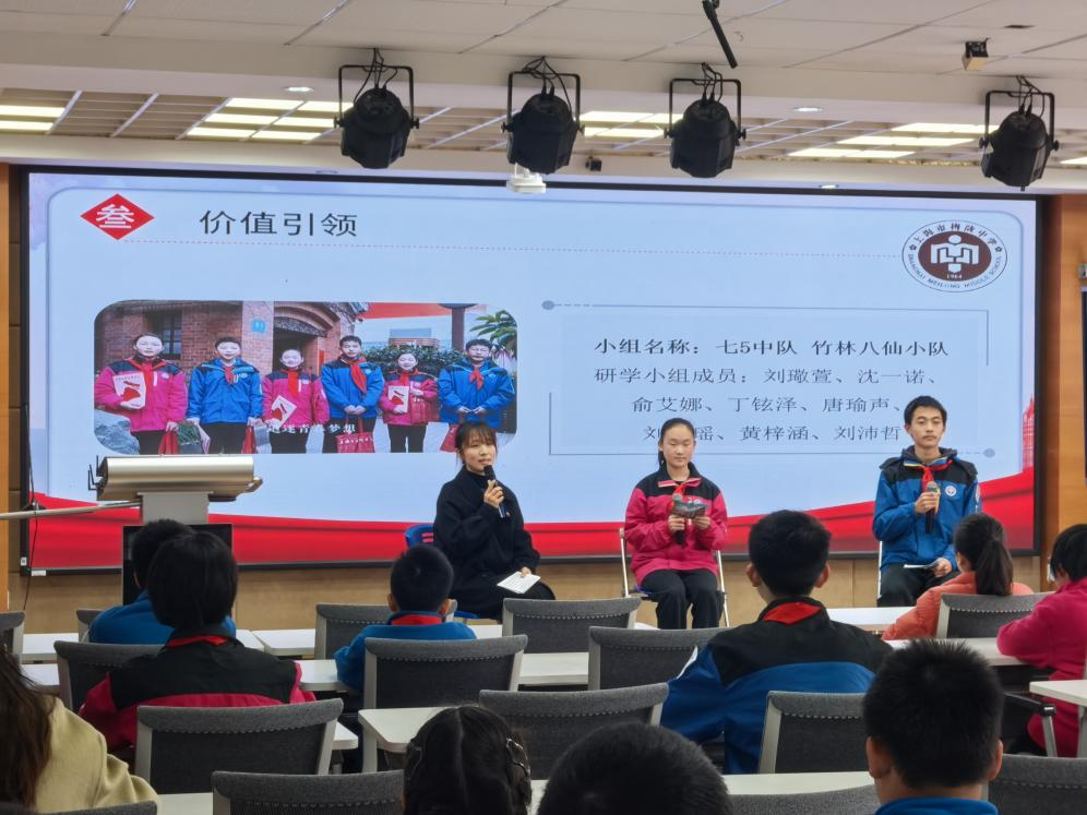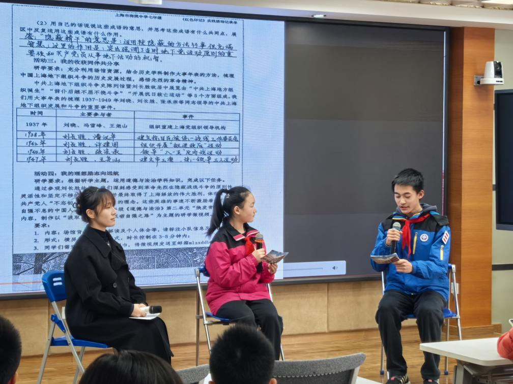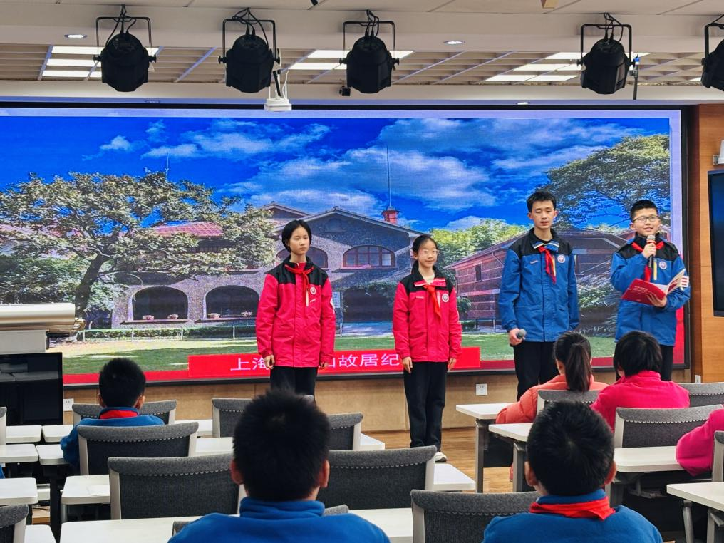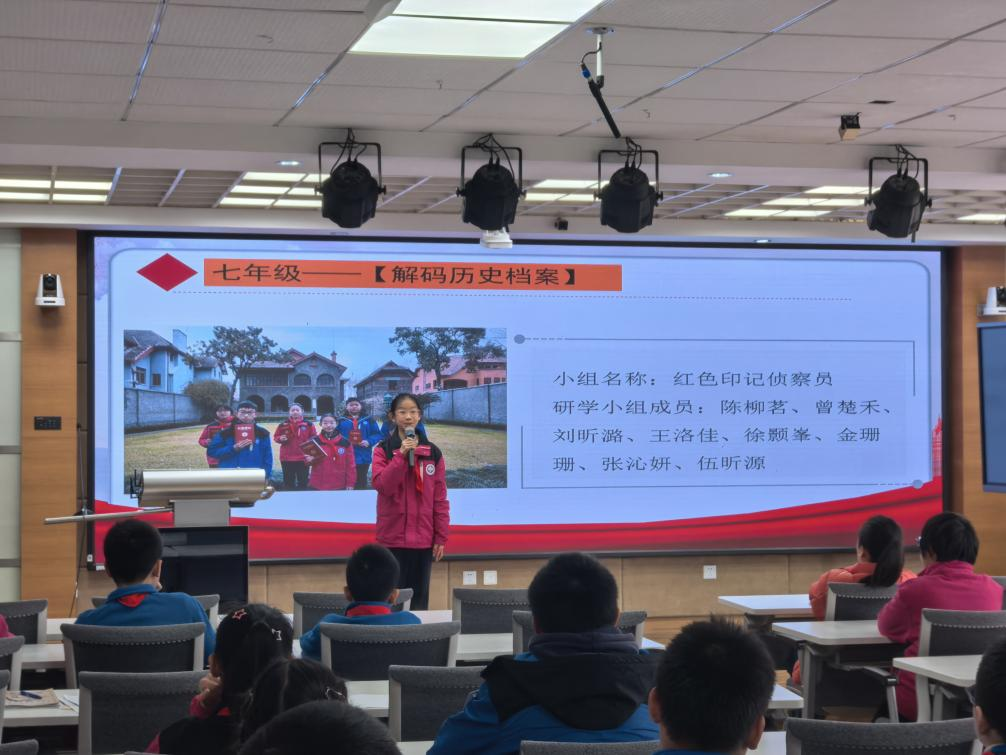 六(1)班的钟文彧同学展示了团队完成的鲁迅纪念馆学习成果,别具一格的研学方式让他对于鲁迅精神有了更立体的认识;七(13)班的李彦臻同学在中国共产党发起组成立地《新青年》(编辑部旧址)读懂了两代青年“强国有我,使命在肩”的呼应;八(9)班的高思闻同学凝视着龙华烈士陵园那些镌刻着24岁、28岁、30岁的墓碑时,感受到这段历史与这座城市、与当代青年的责任紧密相连。