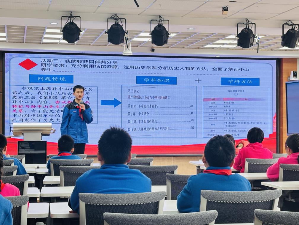 历史学科团队以学生展演的方式,再现探访上海孙中山故居纪念馆的研学情境。六(3)班的严云想同学运用历史文物的分析方法,为馆藏文物《建国方略图》撰写讲解词;七(4)班的陈柳茗同学通过绘制历史时间轴,梳理历史文献中孙中山先生思想变革的脉络;八(4)班的李梓墨同学聚焦时代发展与孙中山先生人生选择的关系,制作孙中山先生的历史大事年表。