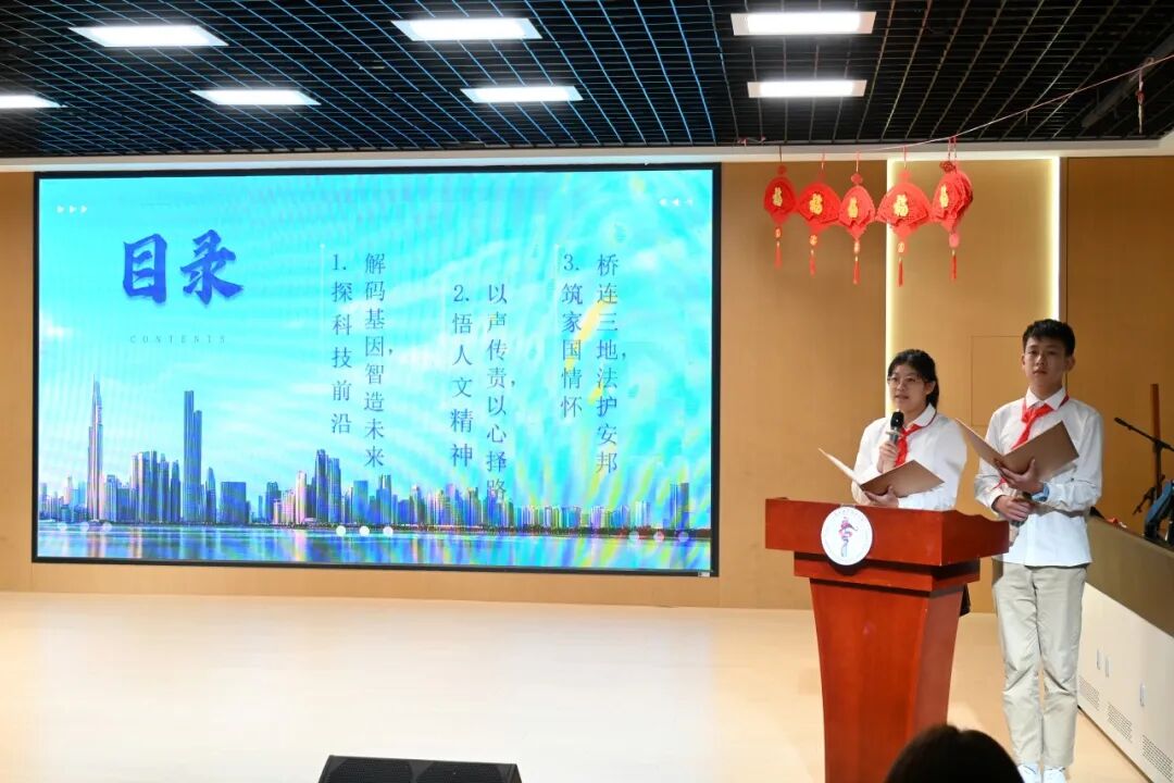 初二20中队国惜之、初三13中队杨亦成、初二3中队杨浩轩、初三13中队蒋悠源四位同学分享了前往粤港澳大湾区的研学收获。从华大基因的生命奥秘,到大疆基地先进的无人机,再到雄伟的港珠澳大桥,他们在前沿科技中,深刻感受到了时代脉搏与家国情怀。研学之旅激励着他们将个人理想融入国家发展的宏伟蓝图。