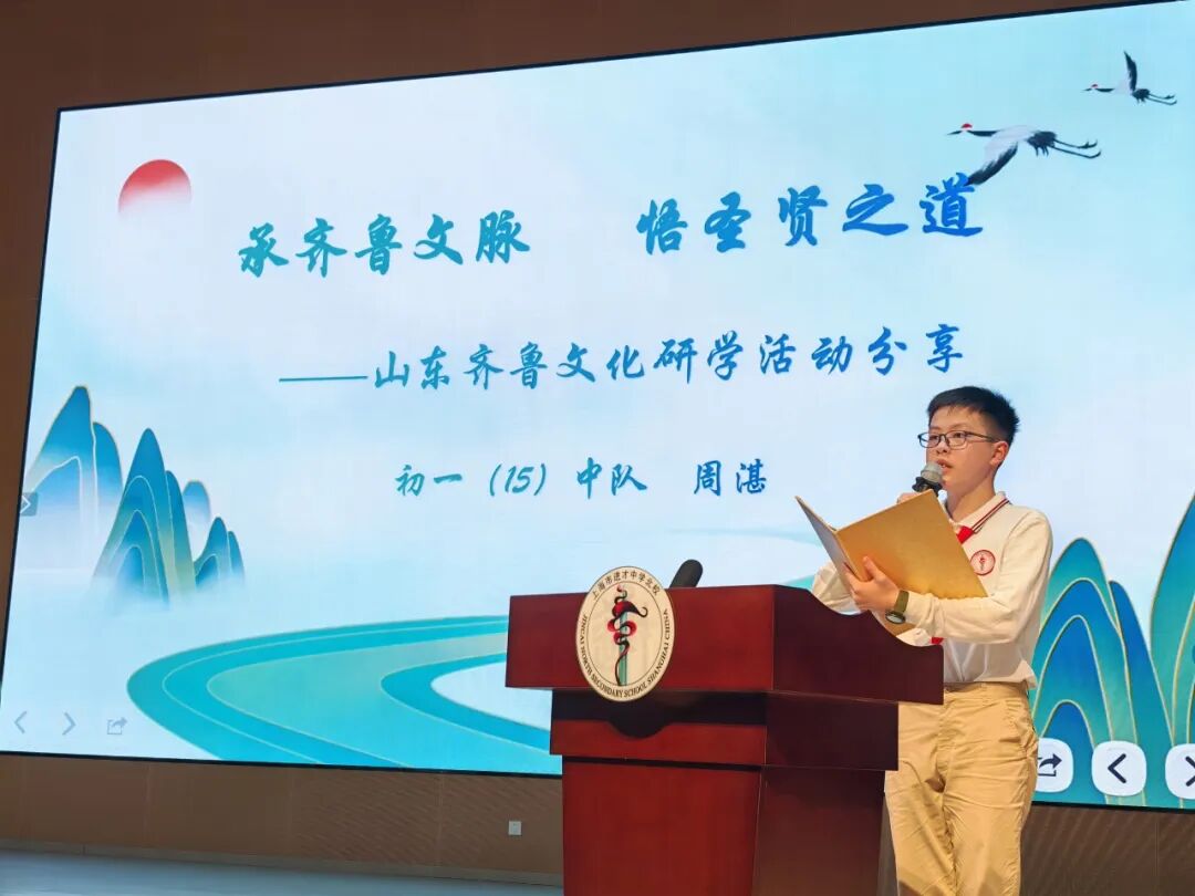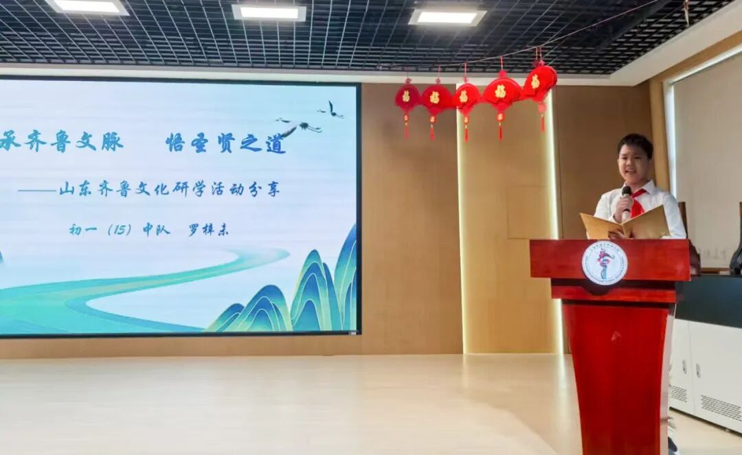 初一15中队周湛、罗梓未同学分享了他们在山东的研学之旅。他们的讲述引领同学们登临泰山之巅,体会“一览众山小”的豪情;走入儒家圣地,感悟“韦编三绝”的治学精神。博大精深的中华文化,在同学们心中种下了传承与弘扬的种子。