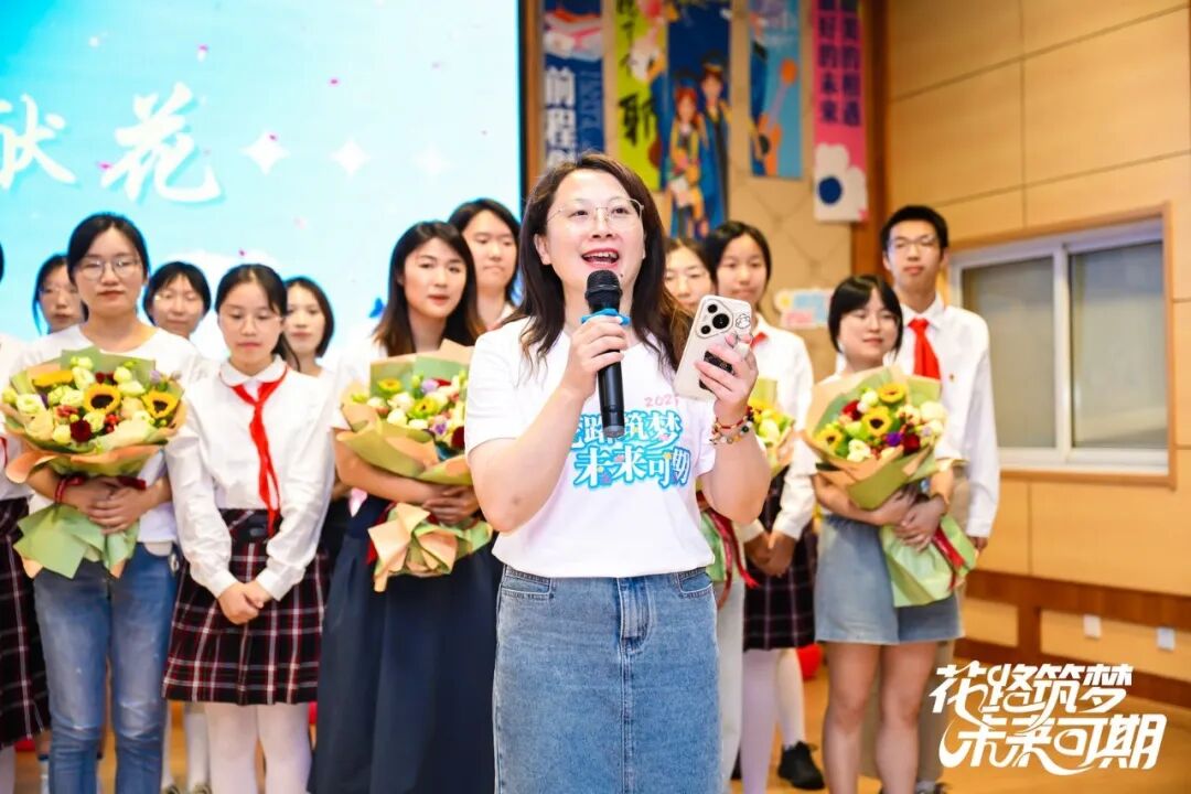 在掌声中,各班班长为22位班主任献花致敬。感恩班主任四年来的守护与教导。年级主任章慧老师代表班主任寄语。