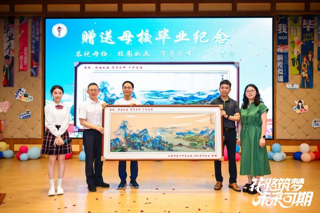 家长代表朱浩成妈妈发言,表达对孩子成长的欣慰与对学校的感恩,并代表初三年级学生与家长赠予母校一幅苏绣——《千里江山图》,承载全体毕业生对母校的爱与祝福。